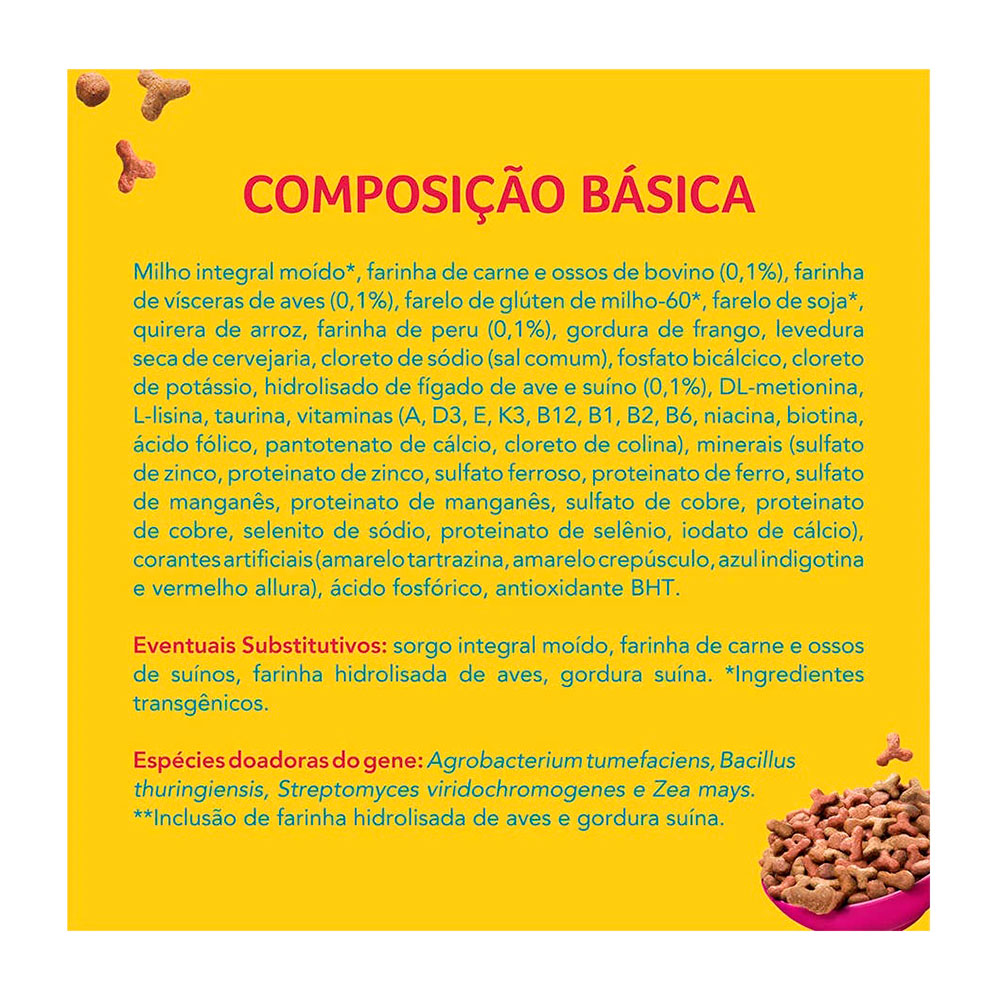 Farinha de vísceras de aves (frango) (mín. 1%), farinha de carne e ossos de bovino (mín. 1%), farinha de carne e ossos de peru (mín. 0,1%), grão de milho*, farelo de soja*, farelo de glúten de milho 60*, cloreto de sódio, carbonato de cálcio, gordura de frango, ácido fosfórico, cloreto de potássio, hidrolisado de fígado de aves e suíno (mín. 0,5%), DL-metionina, taurina, L-lisina, vitaminas (retinol, colecalciferol, acetato de DL-alfa-tocoferol, menadiona bissulfito de sódio, tiamina, riboflavina, niacina (ácido nicotínico), cloridrato de piridoxina, ácido fólico, D-pantotenato de cálcio, cianocobalamina, biotina, cloreto de colina), minerais (sulfato de manganês monohidratado, sulfato ferroso monohidratado, iodato de cálcio, sulfato de cobre pentahidratado, sulfato de zinco monohidratado, selenito de sódio, proteinato de cobre, proteinato de ferro, proteinato de manganês, proteinato de selênio, proteinato de zinco), corantes naturais (caramelo I e carmim de cochonilha), BHT.