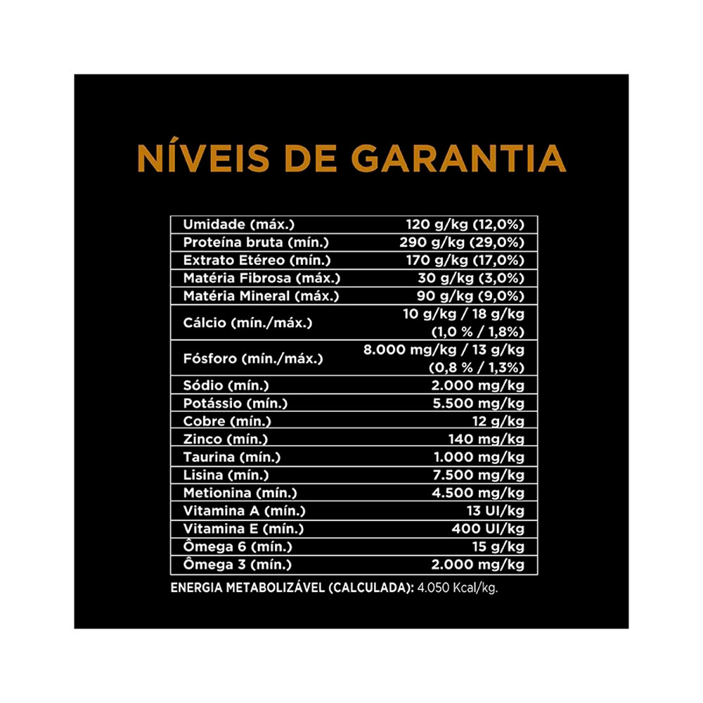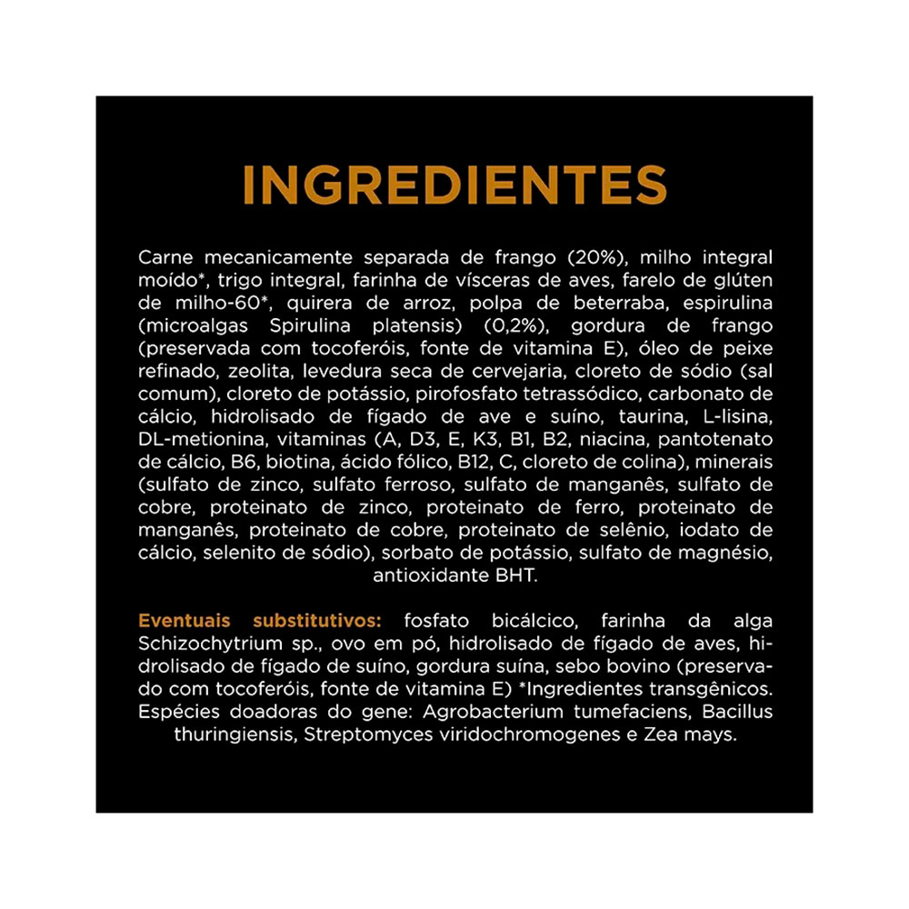 Carne mecanicamente separada de frango (19%), quirera de arroz, farinha de subprodutos de frango, milho integral moído, farelo de glúten de milho, gordura animal estabilizada com tocoferóis (fonte de vitamina E), trigo integral moído, levedura seca de cervejaria (fonte de beta-glucanos) (0,7%), farelo de milho, ovo em pó, óleo de peixe, cloreto de potássio, fosfato bicálcico, pirofosfato tetrassódio (0,33%), cloreto de sódio (sal comum), aleurona de trigo, hidrolisado de fígado de ave e suíno, L-lisina, taurina, DL-metionina, vitaminas (A, D3, E, B12, ácido ascórbico, mononitrato de tiamina, suplemento de riboflavina, cloridrato de piridoxina, niacina, ácido fólico, pantotenato de cálcio, cloreto de colina), minerais (sulfato de zinco, proteinato de zinco, sulfato ferroso, sulfato de cobre, proteinato de cobre, sulfato de manganês, proteinato de manganês, iodato de cálcio, selenito de sódio), antioxidante (BHT).