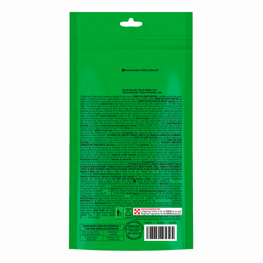 O Petisco Dog Chow Extra Life Saúde Oral é um petisco desenvolvido para promover a saúde bucal de cães adultos de porte médio e grande. Sua fórmula inclui 5 arestas limpadoras que auxiliam na remoção de resíduos e tártaro, além de conter cálcio para fortalecer os dentes.