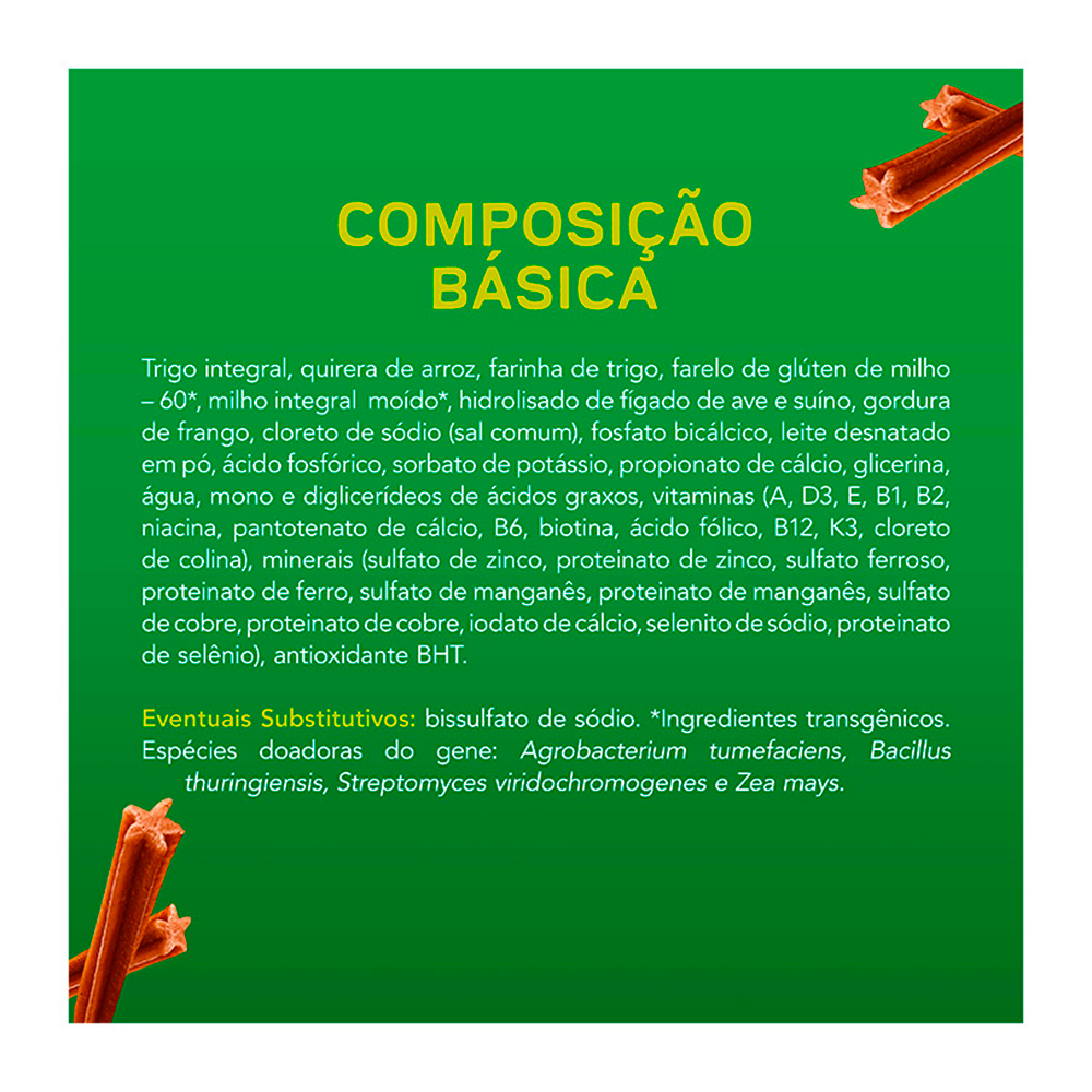 Trigo integral, quirera de arroz, farinha de trigo, farelo de glúten de milho 60**, grão de milho**, hidrolisado de fígado de aves e suíno, óleo de aves, cloreto de sódio, fosfato bicálcico, leite em pó desnatado, ácido fosfórico, sorbato de potássio, propionato de cálcio, glicerina, água, mono e diglicerídeos de ácidos graxos, vitaminas (A, D3, E, K3, B1, B2, B3, B5, B6, B7, B9, B12, cloreto de colina), minerais (sulfato de manganês monohidratado, sulfato ferroso monohidratado, sulfato de cobre pentahidratado, sulfato de zinco monohidratado, organomanganês, organoferro, organocobre, organozinco, organoselênio, iodato de cálcio, selenito de sódio), BHT.