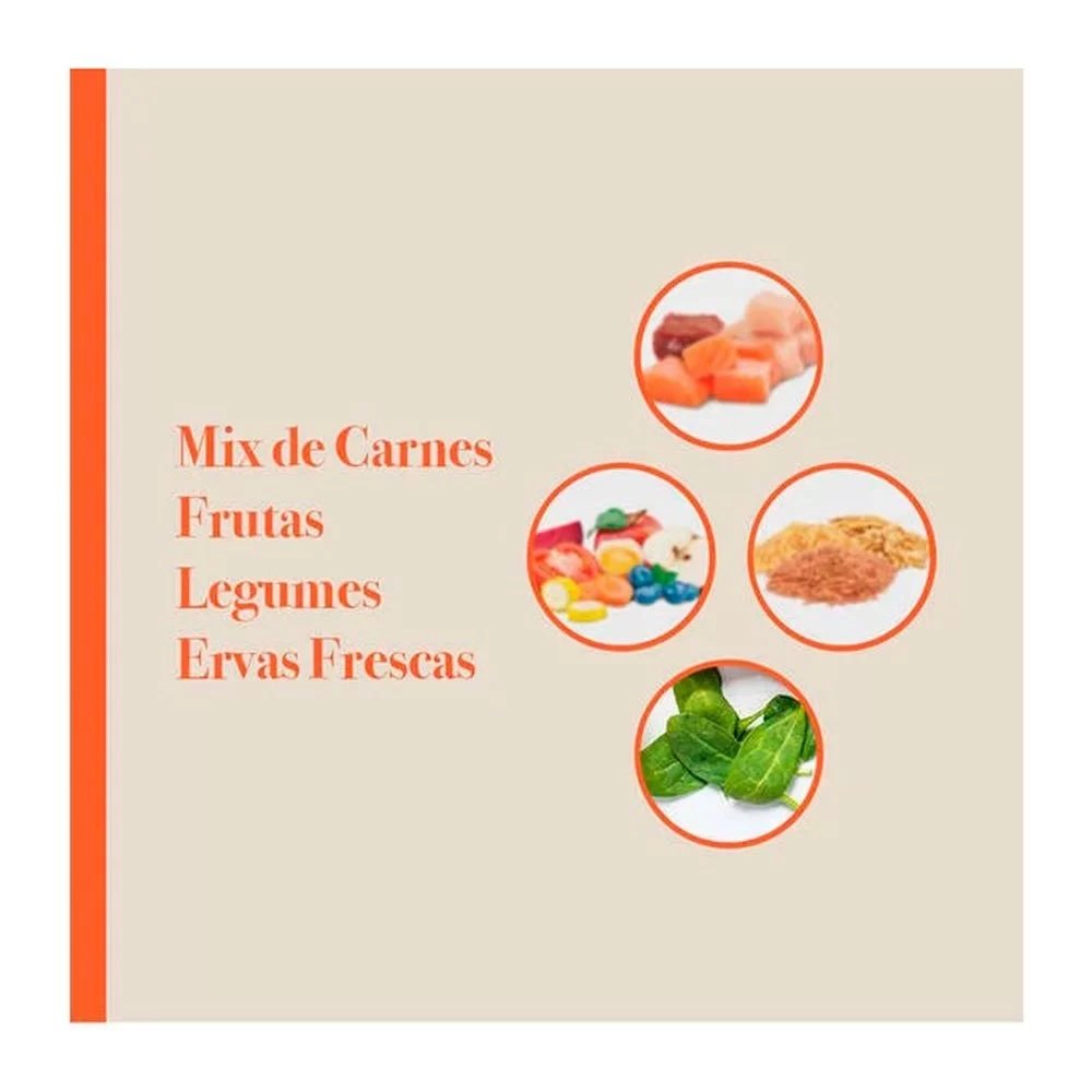Seleção de carnes frescas (filé de castanha, carne de frango e fígado de frango – fontes naturais de glicosamina) (mín. 15%), seleção de frutas, legumes e ervas frescas (maçãs, bananas, beterrabas, cenouras e orégano – fontes naturais de betacaroteno, vitaminas, minerais e fibras) (mín. 5%), blueberry (mirtilo) em pó, polpa de tomate concentrada (fonte natural de licopeno), ovo integral pasteurizado desidratado, farinha de torresmo, óleo de peixe refinado (fonte natural de EPA e DHA), sementes de linhaça, farinha de vísceras de frango e gordura de frango (preservados naturalmente com tocoferóis e extrato de alecrim), aveia, arroz integral, quirera de arroz, hidrolisado de fígado de frango e suíno, cloreto de sódio (sal comum), polpa de beterraba, prebióticos (parede celular de levedura (MOS)), extrato de yucca (mín. 0,02%), zeólita, hexametafosfato de sódio, taurina, DL-metionina, L-lisina, sulfato de glicosamina, sulfato de condroitina, cloreto de potássio, cloreto de colina, vitaminas (A, B1, B2, B6, B12, C, D3, E, K3, H, niacina, ácido pantotênico e ácido fólico), minerais orgânicos (cobre aminoácido-quelato, ferro aminoácido-quelato, manganês aminoácido-quelato, zinco aminoácido-quelato, complexo selênio aminoácido), iodato de cálcio e antioxidantes naturais (concentrado de tocoferóis extrato de alecrim, extrato de chá verde e ácido cítrico).