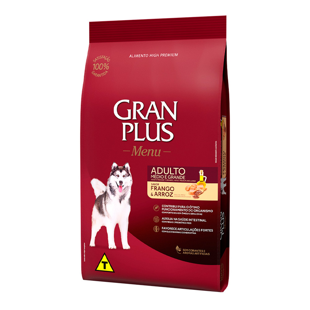 A Ração GranPlus Menu Cães Adultos Frango e Arroz é livre de corantes e aromatizantes artificiais e possui todos os nutrientes necessários para uma alimentação balanceada.