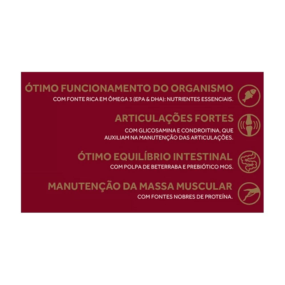 Farinha de Vísceras de Aves, Farelo de Glúten de Milho-601, Quirera de Arroz, Grão de Milho1, Grão de Sorgo, Feijão Bandinha2, Óleo de Aves, Óleo de Peixe Refinado, Óleo de Linhaça, Polpa Desidratada de Beterraba, Farelo de Trigo, Levedura Seca de Cervejaria, Cloreto de Sódio (Sal Comum), Cloreto de Potássio, Sulfato de Glicosamina, Sulfato de Condroitina, Hidrolisado de Fígado de Aves e Suínos, Aditivo Prebiótico (Parede Celular de Levedura Fonte de Mananoligossacarídeos), Antioxidantes (BHA, BHT), Propionato de Cálcio, Sorbato de Potássio, Aditivo Adsorvente (Parede Celular de Levedura e Bentonita), Vitaminas (A, D3, E, K3, B1, B2, B6, B12, Pantotenato de Cálcio, Ácido Fólico, Ácido Nicotínico, Biotina, Cloreto de Colina), Minerais (Sulfato de Zinco, Sulfato de Ferro, Sulfato de Manganês, Iodato de Cálcio, Selenito de Sódio), Minerais Quelatados (Proteinato de Manganês, Levedura Enriquecida com Selênio, Proteinato de Zinco, Proteinato de Cobre).