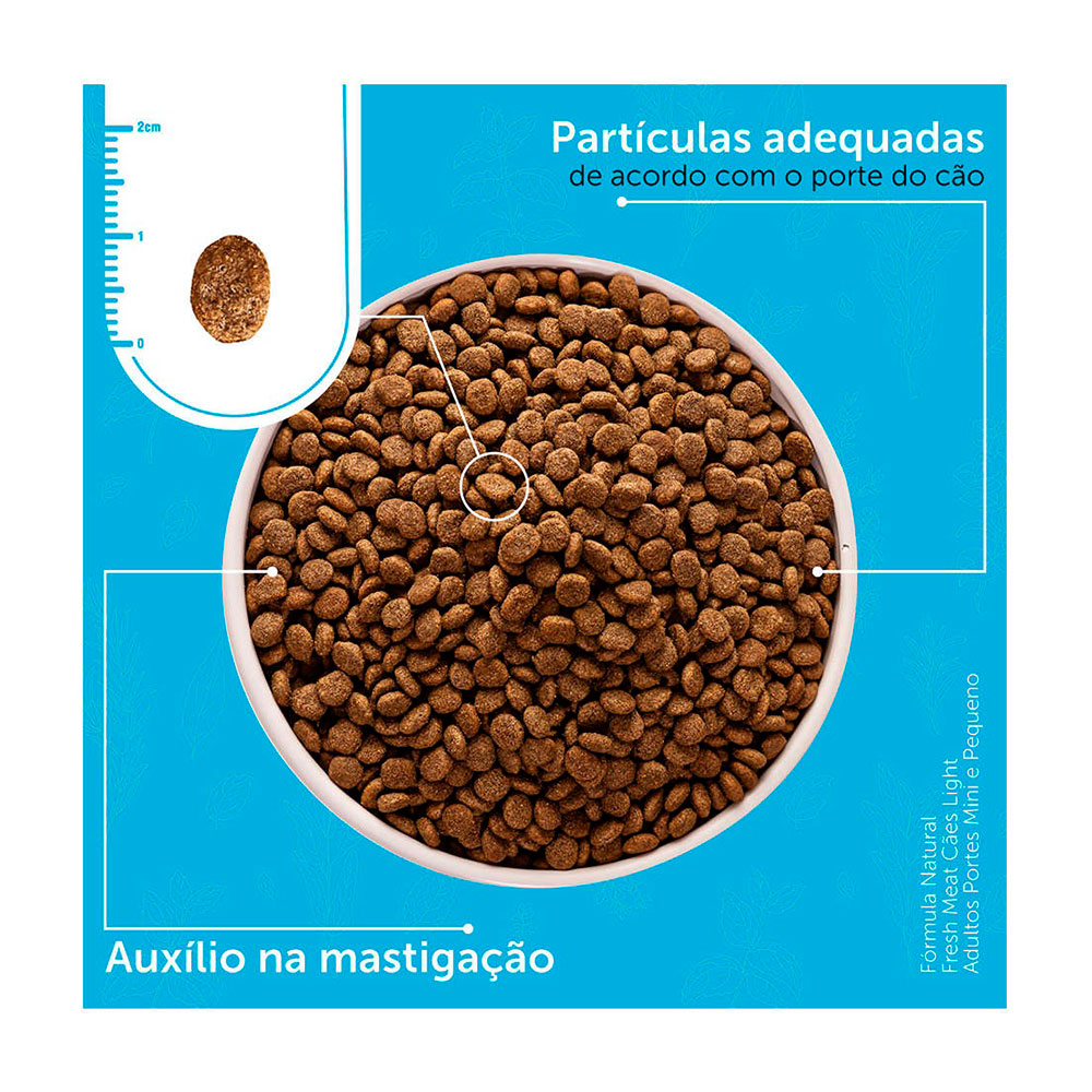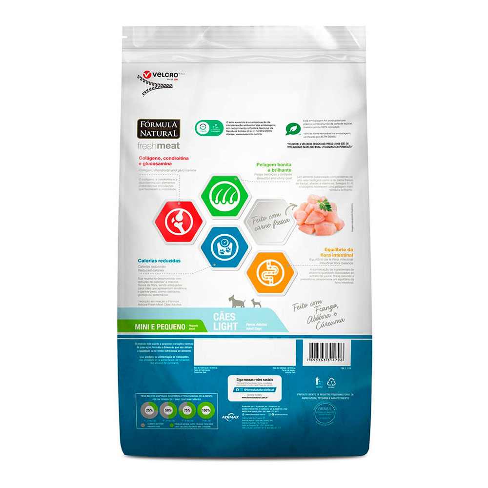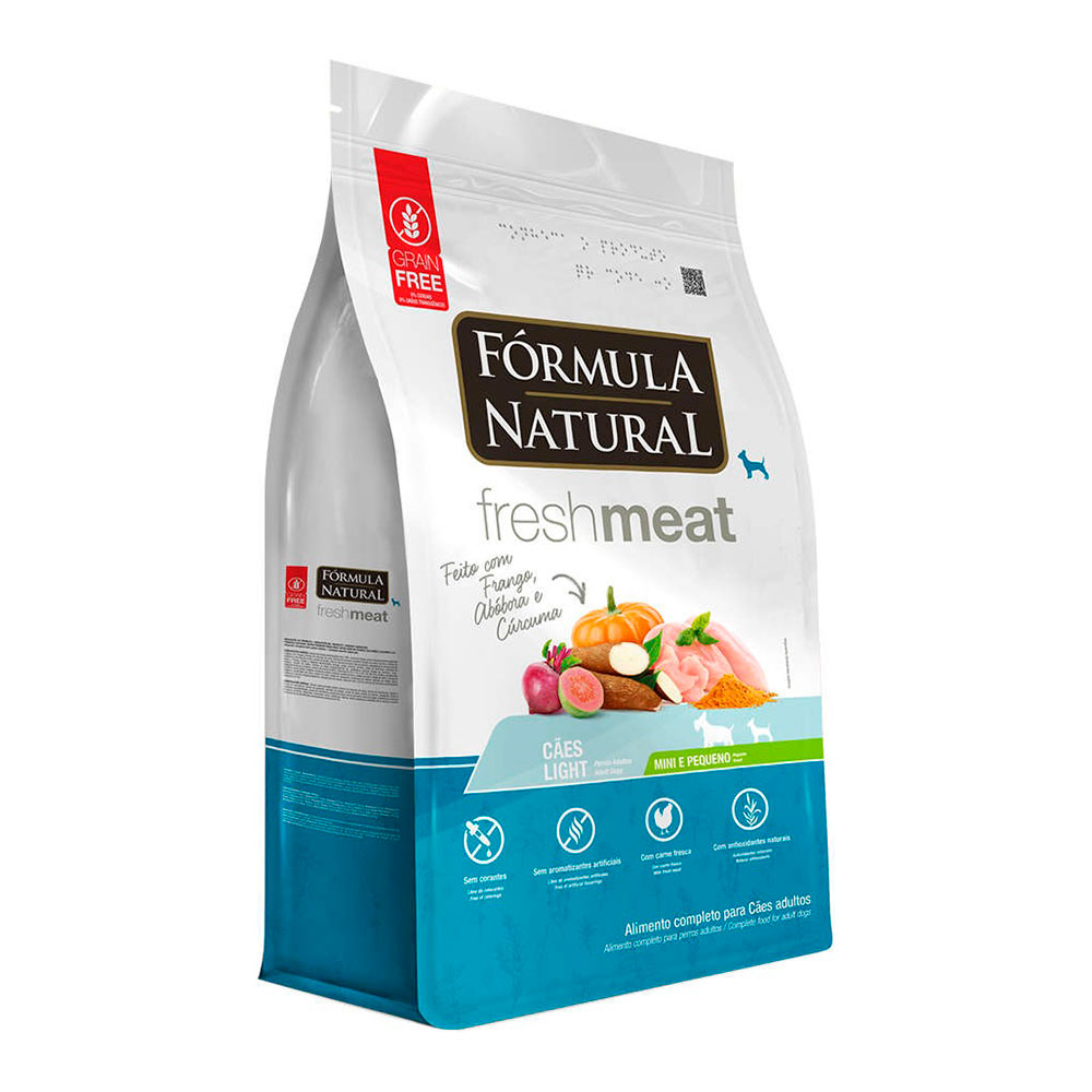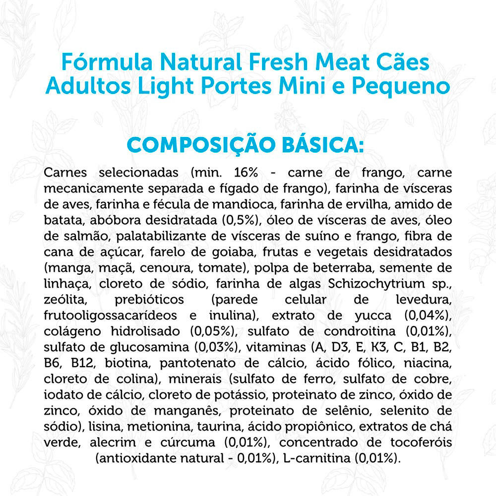 A Ração Fórmula Natural Fresh Meat Light Cães Mini e Pequeno Frango foi desenvolvida por médicos-veterinários utilizando os conceitos mais avançados de nutrição para sua elaboração. Com cortes diferentes de carnes, possui como diferencial uma grande variedade de frutas e vegetais, não utiliza grãos em sua composição.