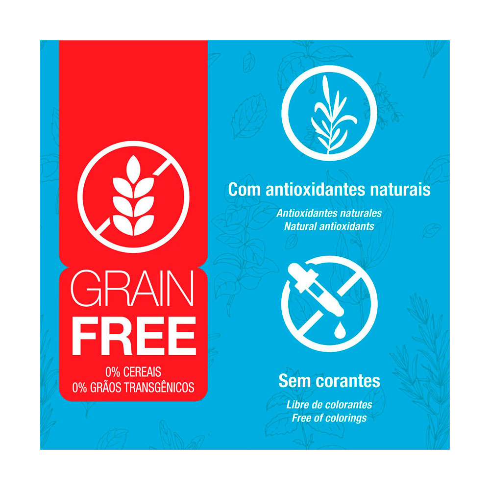 Carnes selecionadas (min. 16% – carne de frango com ossos, carne mecanicamente separada de frango e fígado de frango), farinha de vísceras de aves, farinha e fécula de mandioca, farinha de ervilha, fécula de batata, abóbora desidratada (0,5%), óleo de aves, óleo de salmão, hidrolisado de fígado de aves e suíno, fibra de cana-de-açúcar, fibra de goiaba, frutas e vegetais desidratadas (manga, maçã, cenoura, tomate), polpa de beterraba, grão de linhaça, cloreto de sódio, farinha de algas schizochytrium sp., zeolita, parede celular de levedura, frutooligossacarídeos, inulina, extrato de yucca (0,04%), colágeno hidrolisado (0,05%), sulfato de condroitina (0,01%), sulfato de glicosamina (0,03%), vitaminas (A, D3, E, K3, B1, B2, B5, B6, B12, C, niacina, ácido fólico, biotina, cloreto de colina), minerais (sulfato de ferro, sulfato de manganês, sulfato de zinco, iodato de cálcio, selenito de sódio, sulfato de cobre, proteinato de zinco, levedura enriquecida com selênio, cloreto de potássio, proteinato de manganês), lisina, metionina, taurina, ácido propiônico, extratos de chá verde, hortelã e alecrim, cúrcuma (0,01%), concentrado de tocoferóis (antioxidante natural) (0,01%), L-carnitina (0,001%).