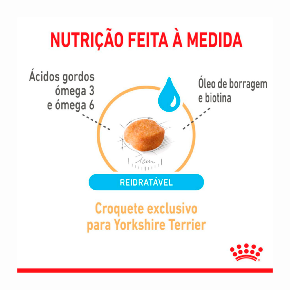 Sua fórmula ajuda a manter a pele saudável e o pelo nutrido, garantindo um aspecto brilhante e sedoso. O croquete seco foi cuidadosamente desenvolvido para atender às necessidades dos Yorkshire envelhecidos, com formato, tamanho e textura projetados para promover a saúde dentária.