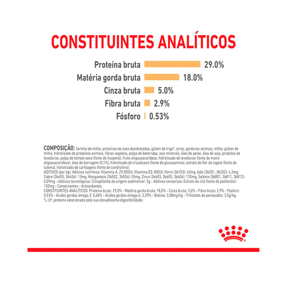 Milho moído, quirera de arroz, farinha de vísceras de aves, farinha de torresmo, farelo de glúten de milho*, gordura de frango, gordura suína, glúten de trigo, polpa desidratada de beterraba, fibra de soja*, óleo branqueado e desodorizado de peixes, óleo de soja refinado*, levedura de cervejaria inativada desidratada, tomate desidratado, óleo de borragem, hidrocloreto de glicosamina, sulfato de condroitina, carbonato de cálcio, cloreto de potássio, cloreto de sódio (sal comum), óxido de magnésio, tripolifosfato de sódio, sorbato de potássio, frutooligossacarídeos (0,35%), mananoligossacarídeos (0,20%), extrato de marigold (Tagetes erecta), extrato de chá verde (Camélia sinenses), zeolita, retinol (vitamina A), ácido ascórbico (vitamina C), colecalciferol (vitamina D3), acetato de dl-alfa tocoferol (vitamina E), cloridrato de tiamina (vitamina B1), riboflavina (vitamina B2), cloridrato de piridoxina (vitamina B6), cianocobalamina (vitamina B12), ácido nicotínico (niacina), D-pantotenato de cálcio, biotina, ácido fólico, cloreto de colina, betacaroteno, sulfato de ferro, sulfato de cobre, óxido de zinco, óxido de manganês, iodato de cálcio, levedura enriquecida com selênio, zinco aminoácido quelato, manganês aminoácido quelato, cobre aminoácido quelato, tirosina, DL-metionina, taurina, L-carnitina, hidrolisado de fígado de aves, antioxidante BHA (butilhidroxianisol).