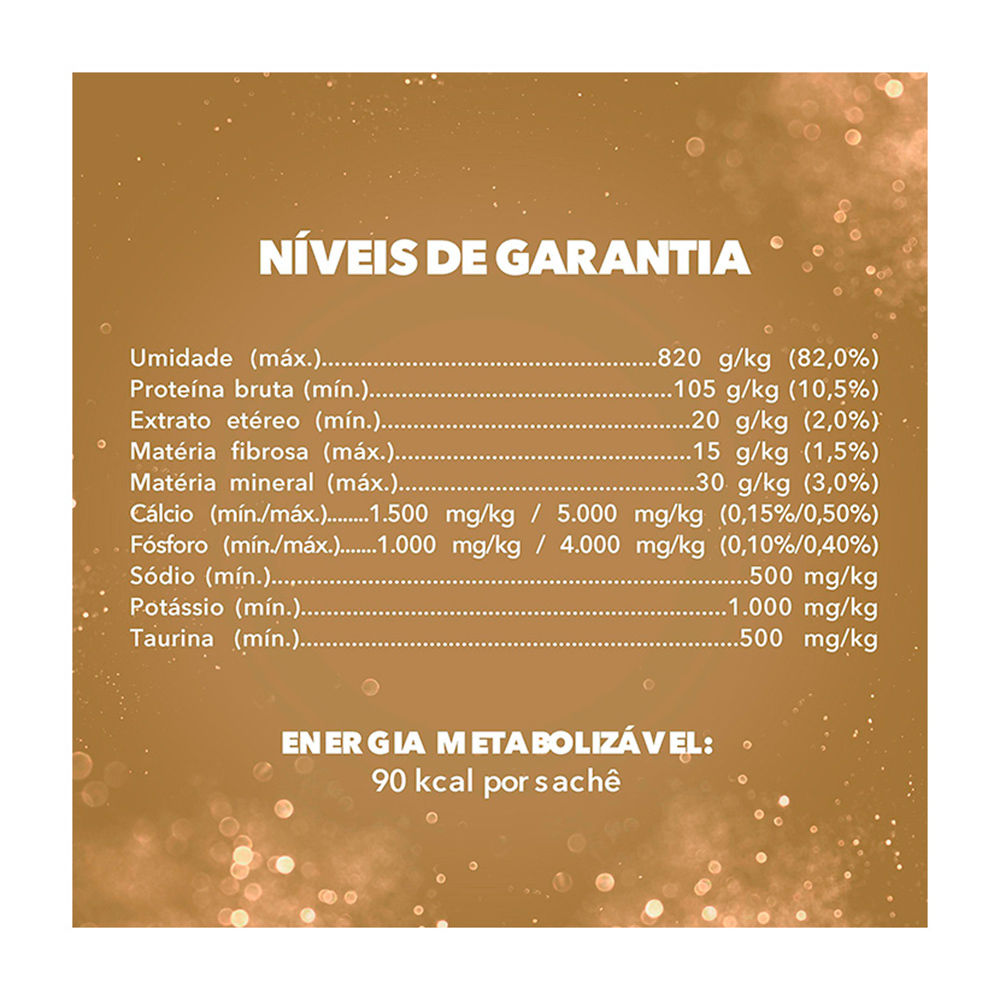 Com proteínas de alta qualidade como primeiro ingrediente, garantindo uma alimentação saudável e saborosa. Feito com delicados pedaços de frango e peru cortados e imersos em bastante molho.