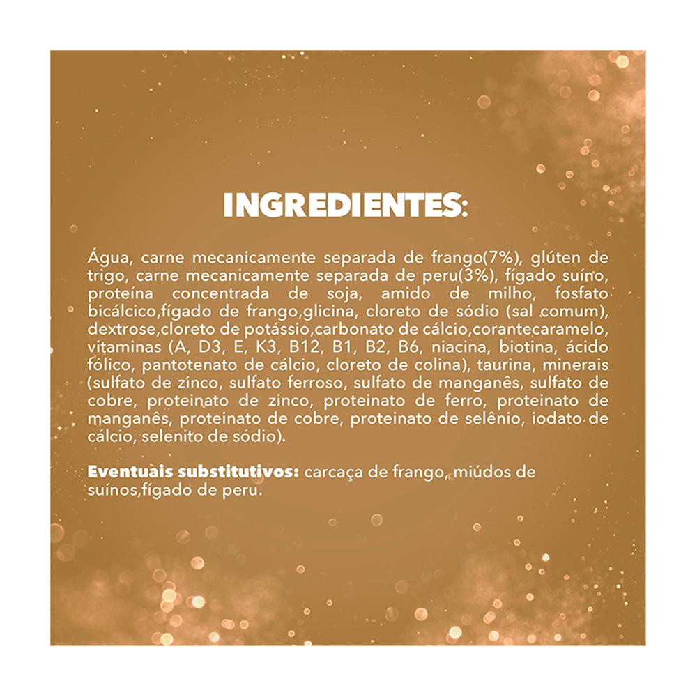 Água, carne mecanicamente separada de frango(7%), glúten de trigo, carne mecanicamente separada de peru(3%), fígado suíno, proteína concentrada de soja, amido de milho, fosfato bicálcico,fígado de frango,glicina, cloreto de sódio (sal comum), dextrose,cloreto de potássio,carbonato de cálcio,corantecaramelo, vitaminas (A, D3, E, K3, B12, B1, B2, B6, niacina, biotina, ácido fólico, pantotenato de cálcio, cloreto de colina), taurina, minerais (sulfato de zinco, sulfato ferroso, sulfato de manganês, sulfato de cobre, proteinato de zinco, proteinato de ferro, proteinato de manganês, proteinato de cobre, proteinato de selênio, iodato de cálcio, selenito de sódio).Eventuais Substitutivos: carcaça de frango, miúdos de suínos,fígado de peru.