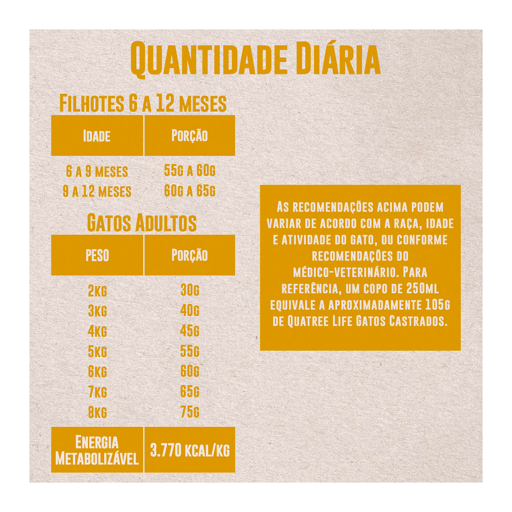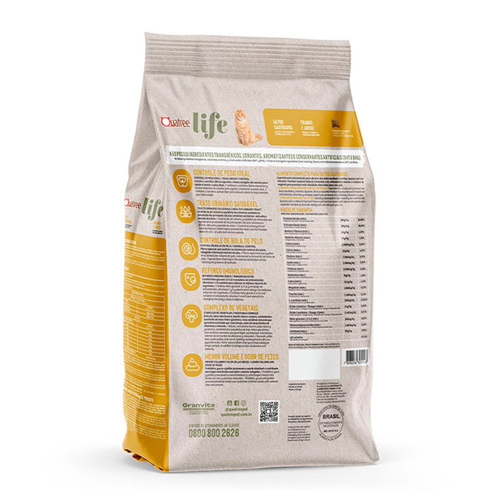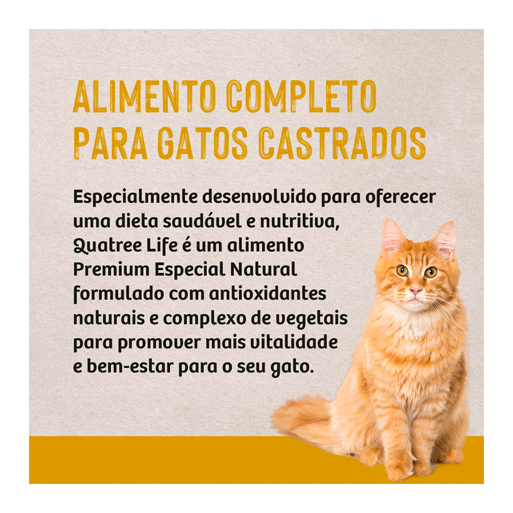 Ração Quatree Life Gatos Castrados é um alimento Premium Especial Natural formulado com antioxidantes naturais e complexo de vegetais para promover mais vitalidade e bem-estar para o seu gato.