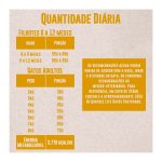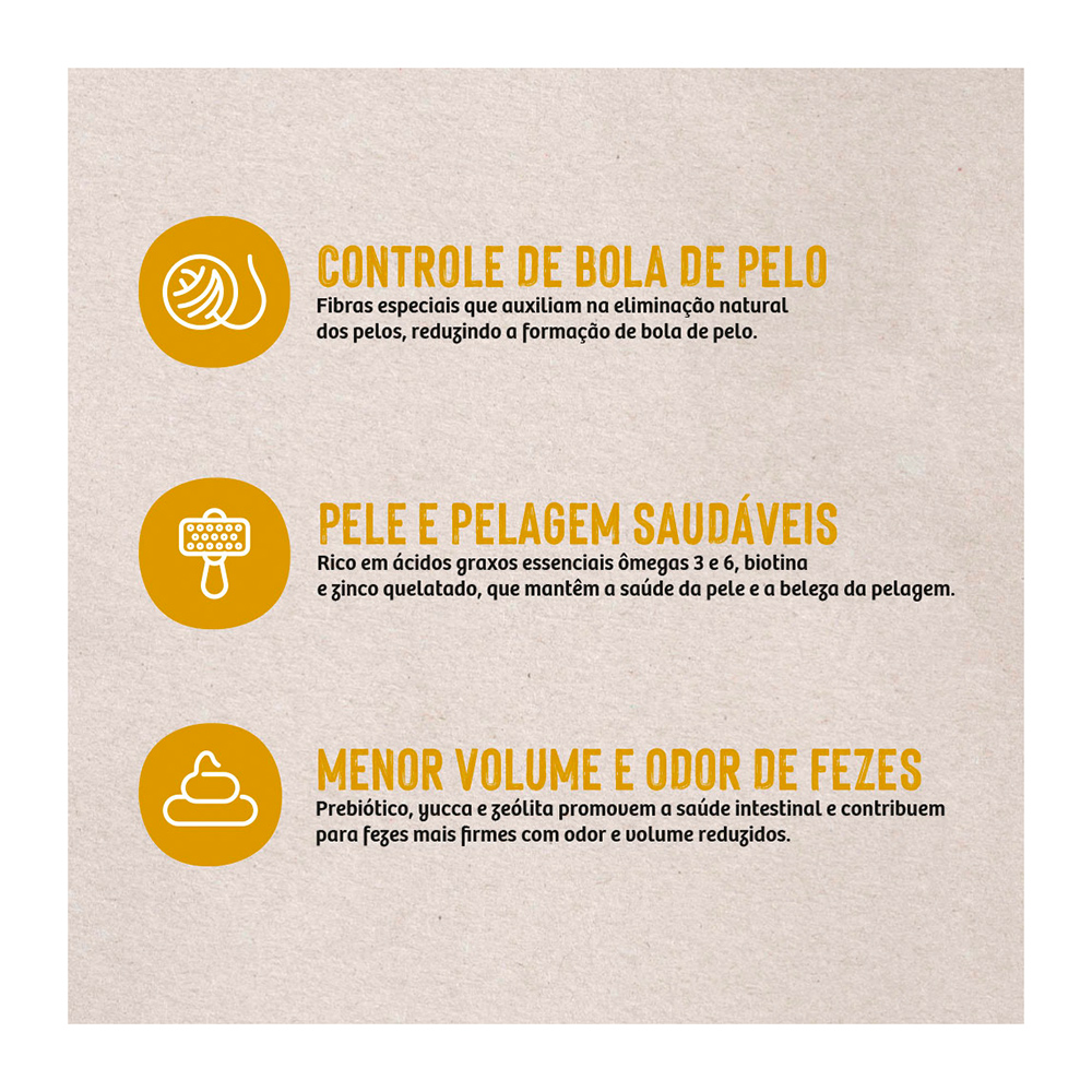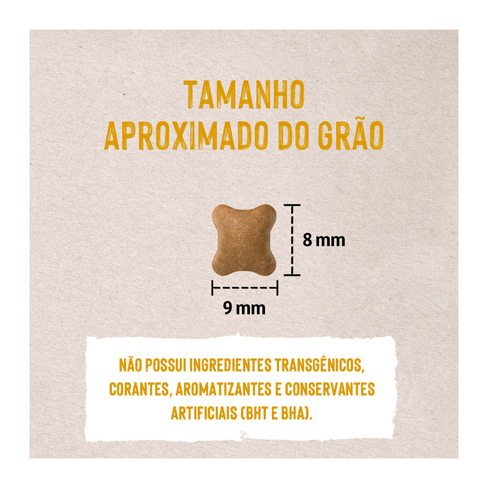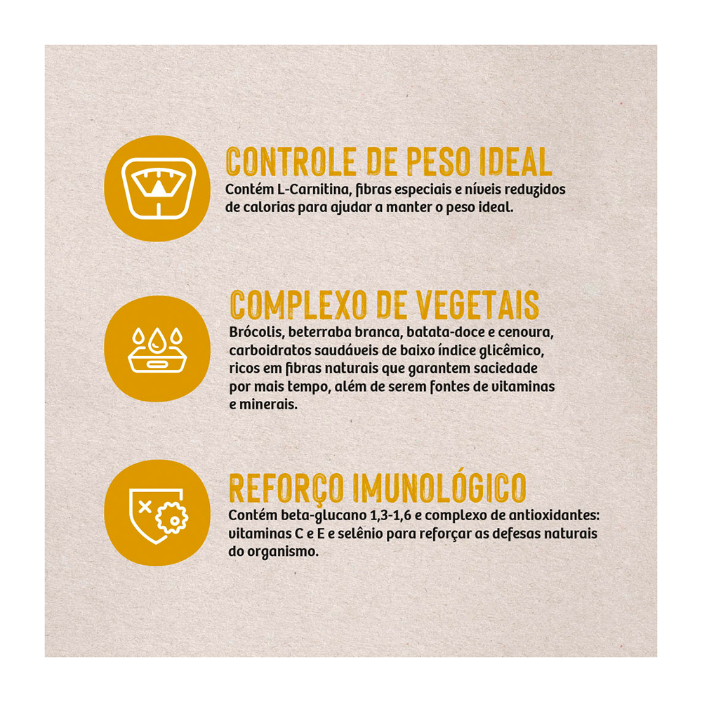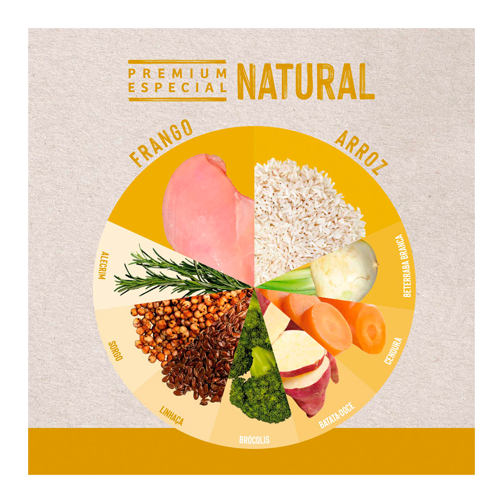Farinha de vísceras de frango (mín. 28%), farinha de torresmo, arroz quebrado (mín. 20%), sorgo integral moído, gordura de aves, gordura suína, farinha de peixes, complexo de vegetais (mín. 2,5%) (farinha de batata-doce, polpa desidratada de beterraba, brócolis desidratado, cenoura desidratada), grão de linhaça, levedura de cervejaria inativada desidratada, celulose, zeólita, lignocelulose, cloreto de potássio, parede celular de levedura (fonte de beta-glucano 1,3-1,6), hidrolisado de fígado de aves e suíno, mananoligossacarídeo (MOS) (mín. 0,1%), extrato de yucca (mín. 0,03%), extrato de alecrim (mín. 0,001%), tocoferol (concentrado mín. 0,09%), lisina, metionina, ácido fosfórico, taurina, L-carnitina, acetato de retinol (vit. A), colecalciferol (vit. D3), ácido ascórbico (vit. C), acetato de DL-alfa-tocoferol (vit. E), mononitrato de tiamina (vit. B1), riboflavina (vit. B2), cloridrato de piridoxina (vit. B6), cianocobalamina (vit. B12), menadiona bissulfito de nicotinamida (vit. K3), biotina, cloreto de colina, niacina (vit. B3), ácido fólico (vit. B9), D-pantotenato de cálcio (vit. B5), sulfato de cobre monohidratado, sulfato de ferro, sulfato de zinco, sulfato de manganês, selenito de sódio, iodato de cálcio, minerais quelatados (proteinato de manganês, proteinato de selênio, proteinato de zinco).