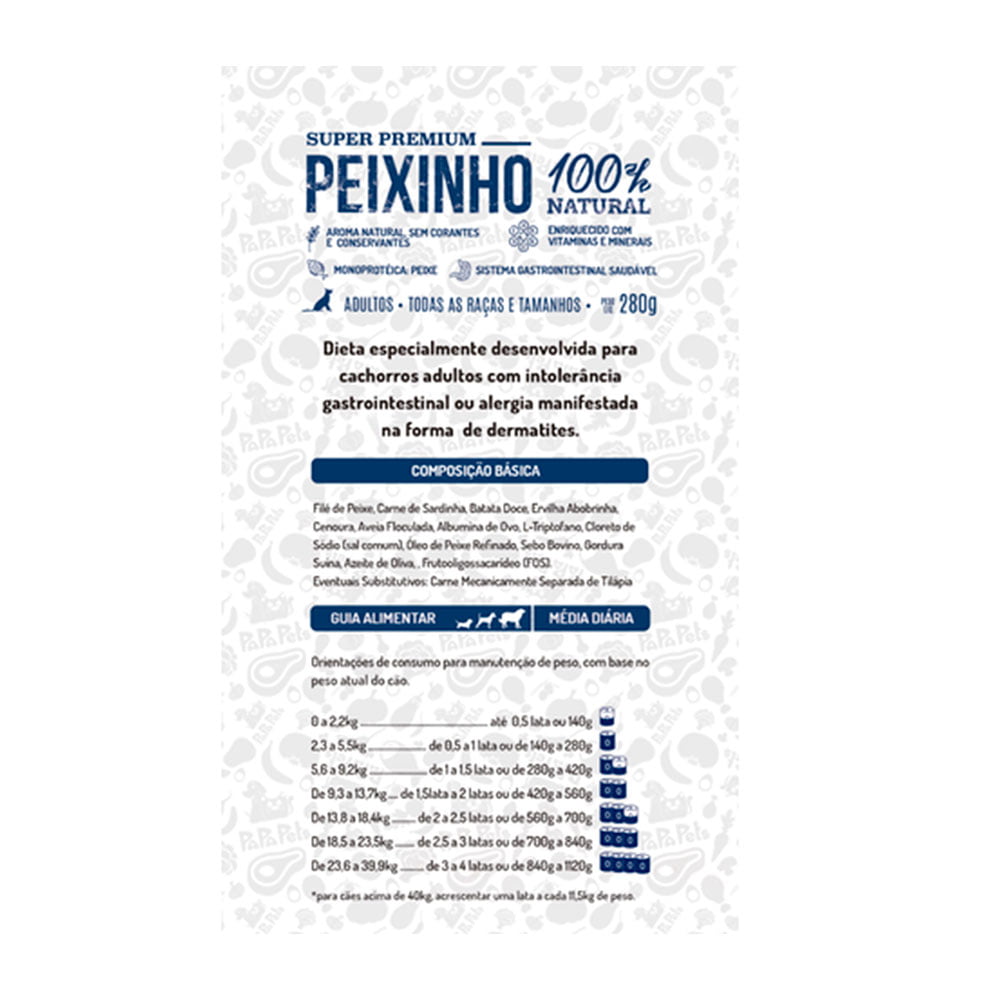 Papapets Peixinho Cães Adultos pode ser consumido por cães de todas as raças e portes. Contém proteínas frescas, baixo sódio e nutrientes essenciais que o seu cachorro precisa no dia-a-dia, sem contar que por ser um alimento úmido, vai auxiliar no bom funcionamento do trato urinário através da reposição de líquidos e sais minerais.