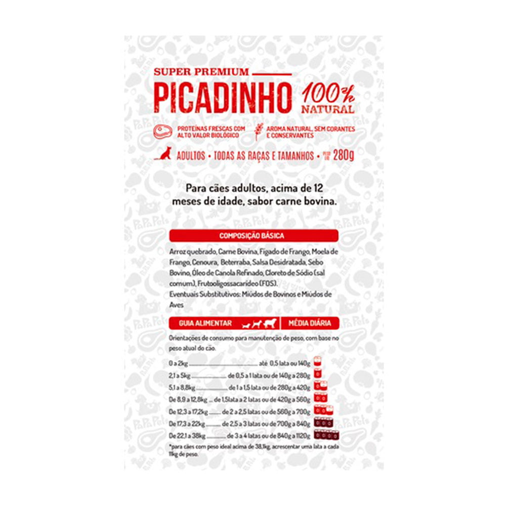 Papapets Picadinho Cães Adultos pode ser consumido por cães de todas as raças e portes. Contém proteínas frescas, baixo sódio e nutrientes essenciais que o seu cachorro precisa no dia-a-dia, sem contar que por ser um alimento úmido, vai auxiliar no bom funcionamento do trato urinário através da reposição de líquidos e sais minerais.