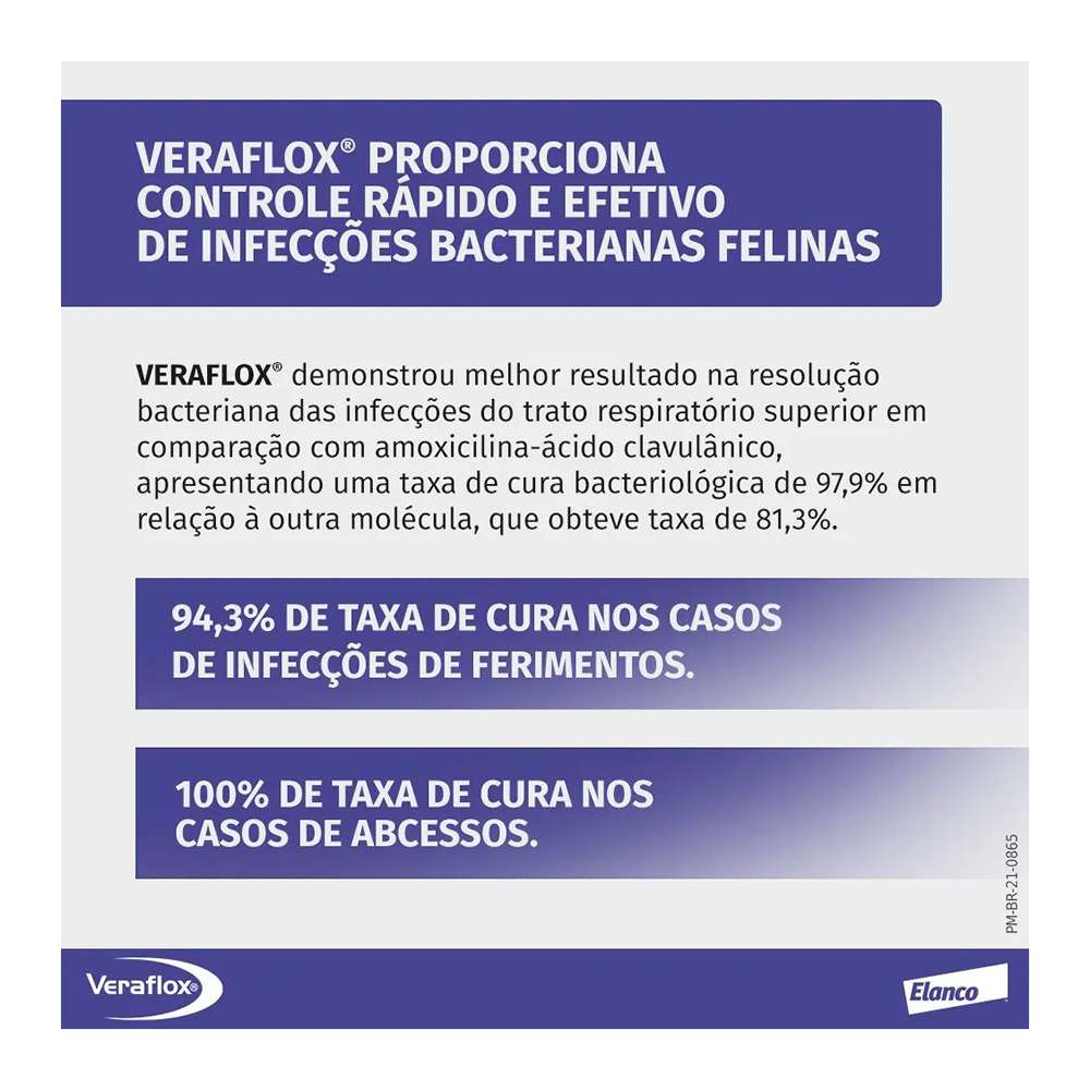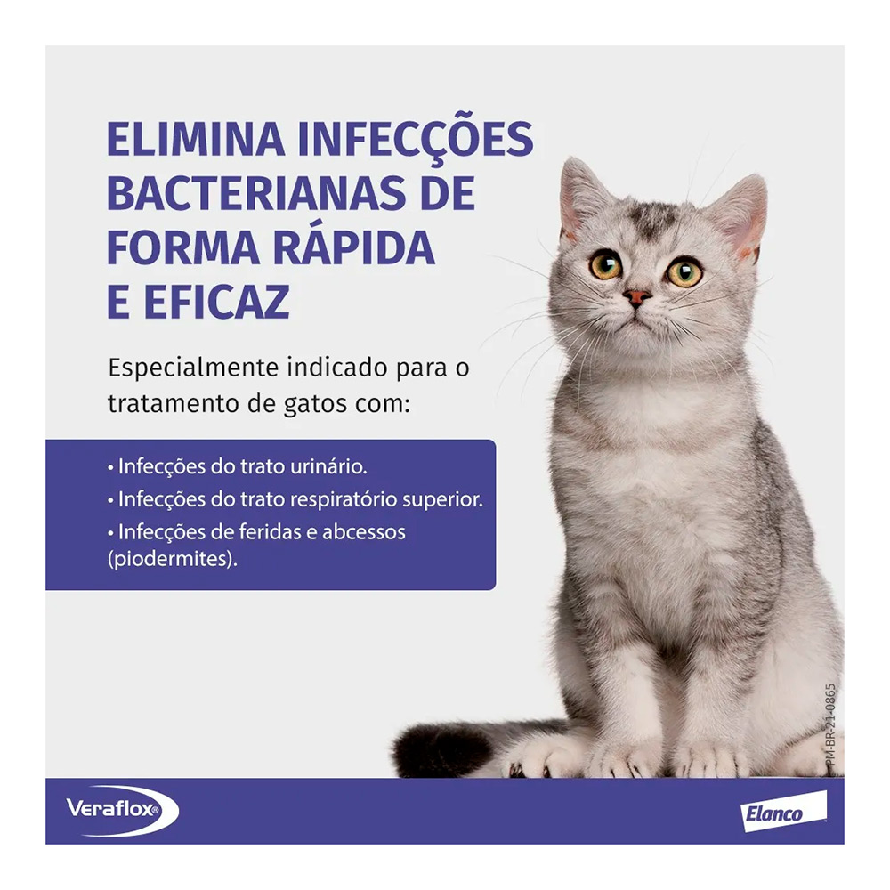 Veraflox em suspensão oral é altamente palatável facilitando a administração em gatos. Sua fórmula tem elevada eficácia, garantindo qualidade e segurança podendo ser usado em gatos a partir de 6 semanas de vida.