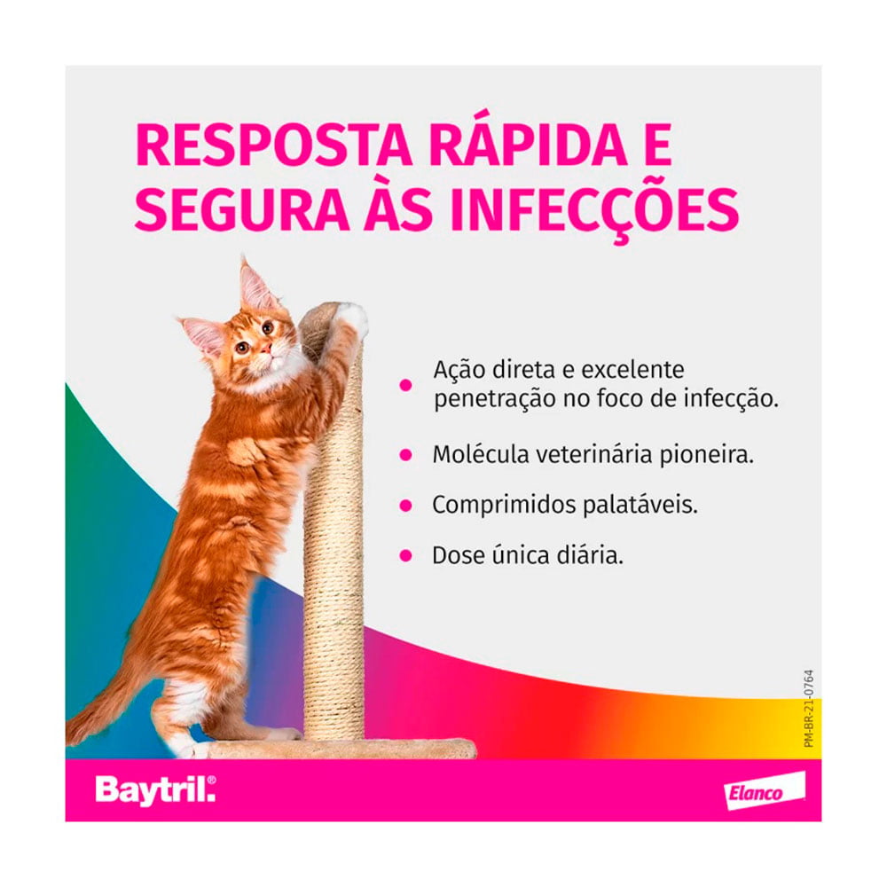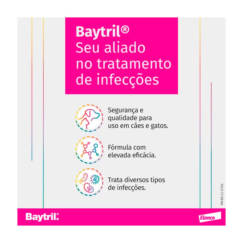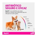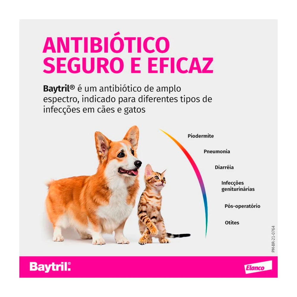 Baytril® é seu aliado contra infecções em cães e gato. Potente antibiótico de ação bactericida, ideal para o tratamento de infecções como piodermites, infecções respiratórias, infecções entéricas, otites, infecções geniturinárias, além de ser indicado também em pós-operatórios.