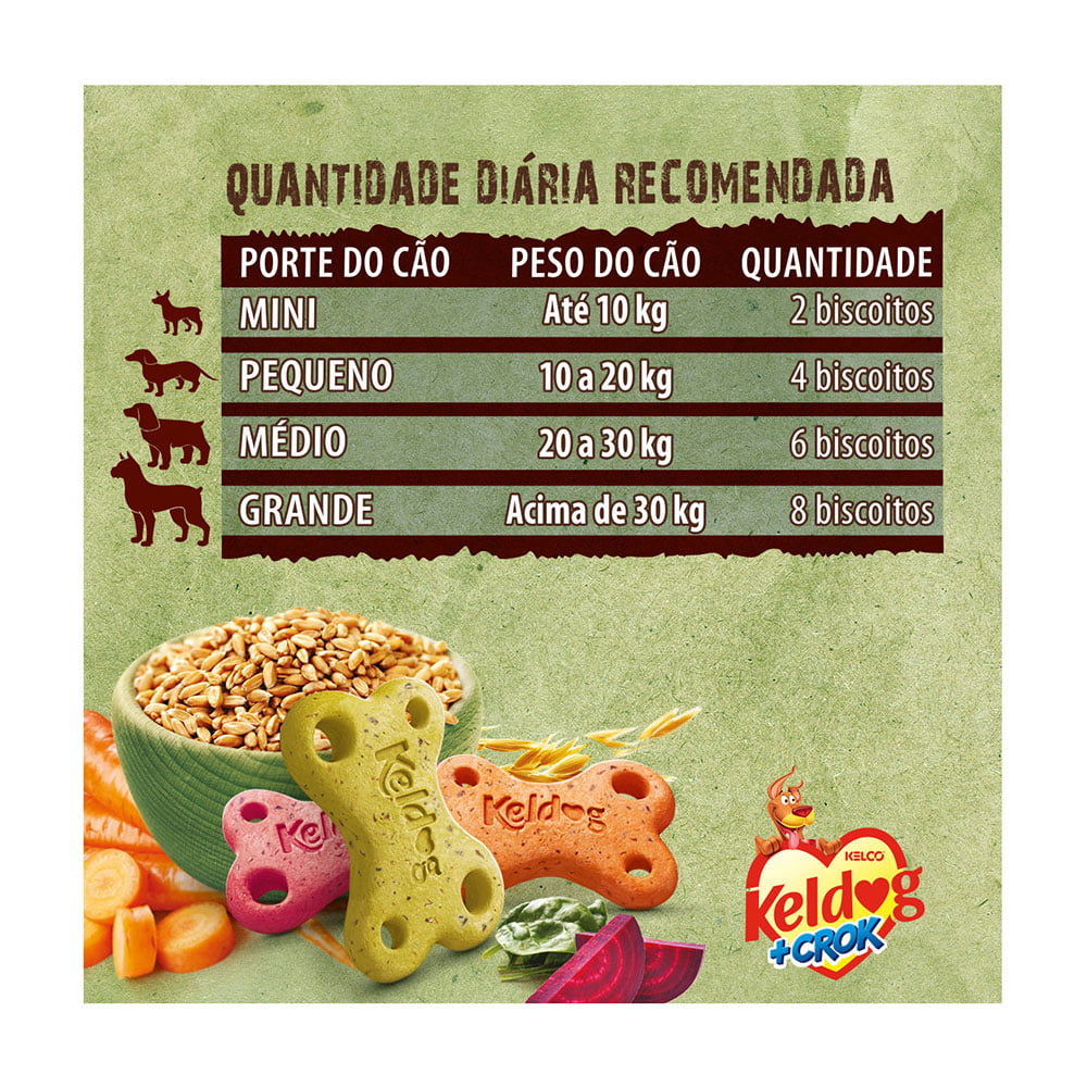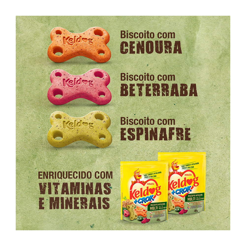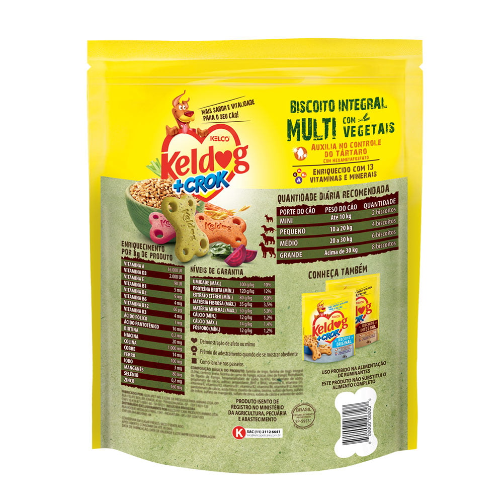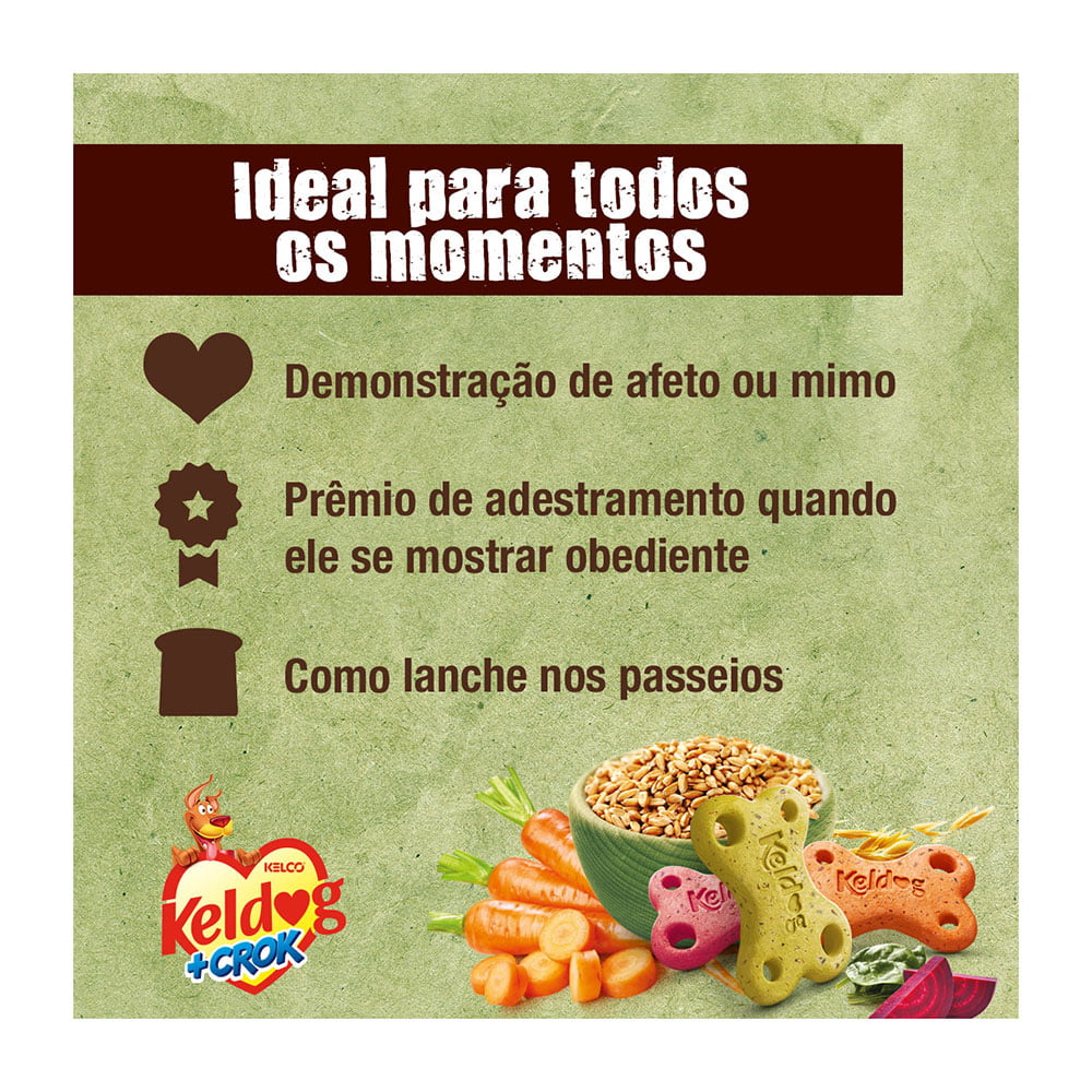 Mix de biscoitos nos sabores cenoura, beterraba e espinafre Keldog +Crok Biscoito Multi é enriquecido com vitaminas e minerais e possui hexametafosfato que, auxilia no controle do tártaro.
