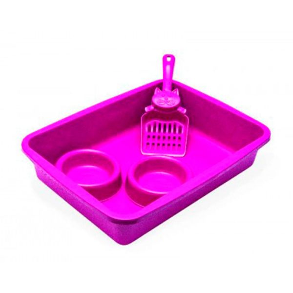 Possui pazinha para recolher os dejetos e auxiliar na limpeza e colocação da areia, além disso tem um comedouro e um bebedouro com tamanho ideal e quantidade na dose certa para o seu felino.