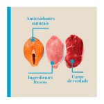 Seleção de carnes frescas (filé de castanha, carne de frango e fígado de frango – fontes naturais de glutamina e glicosamina) (mín. 15%), seleção de frutas, legumes e ervas frescas (maçãs, mamões, cenouras, beterrabas e orégano – fontes naturais de glutamina, betacaroteno, vitaminas, minerais e fibras) (mín. 5%), polpa de tomate concentrada (fonte natural de licopeno), blueberry (mirtilo) em pó, ovo integral pasteurizado desidratado, farinha de torresmo, óleo de peixe refinado (fonte natural de EPA e DHA), sementes de linhaça, farinha de vísceras de frango e gordura de frango (preservados naturalmente com tocoferóis e extrato de alecrim), aveia, arroz integral, quirera de arroz, fibra de ervilha, polpa de beterraba, prebióticos (parede celular de levedura (MOS – mín. 0,03%) e inulina (FOS – mín. 0,1%)), hidrolisado de fígado de frango e suíno, sulfato de glicosamina, sulfato de condroitina, L-carnitina, cloreto de sódio (sal comum), extrato de yucca (mín. 0,02%), zeólita, hexametafosfato de sódio (mín. 0,3%), DL-metionina, L-lisina, cloreto de potássio, cloreto de colina, vitaminas (A, B1, B2, B6, B12, C, D3, E, K3, H, niacina, ácido pantotênico, ácido fólico), minerais orgânicos (cobre aminoácido-quelato, ferro aminoácido-quelato, manganês aminoácido-quelato, zinco aminoácido-quelato, complexo selênio aminoácido), iodato de cálcio e antioxidantes naturais (extrato de chá verde, concentrado de tocoferóis, extrato de alecrim e ácido cítrico).