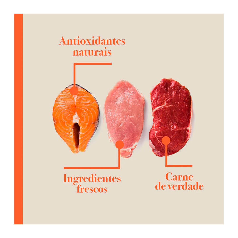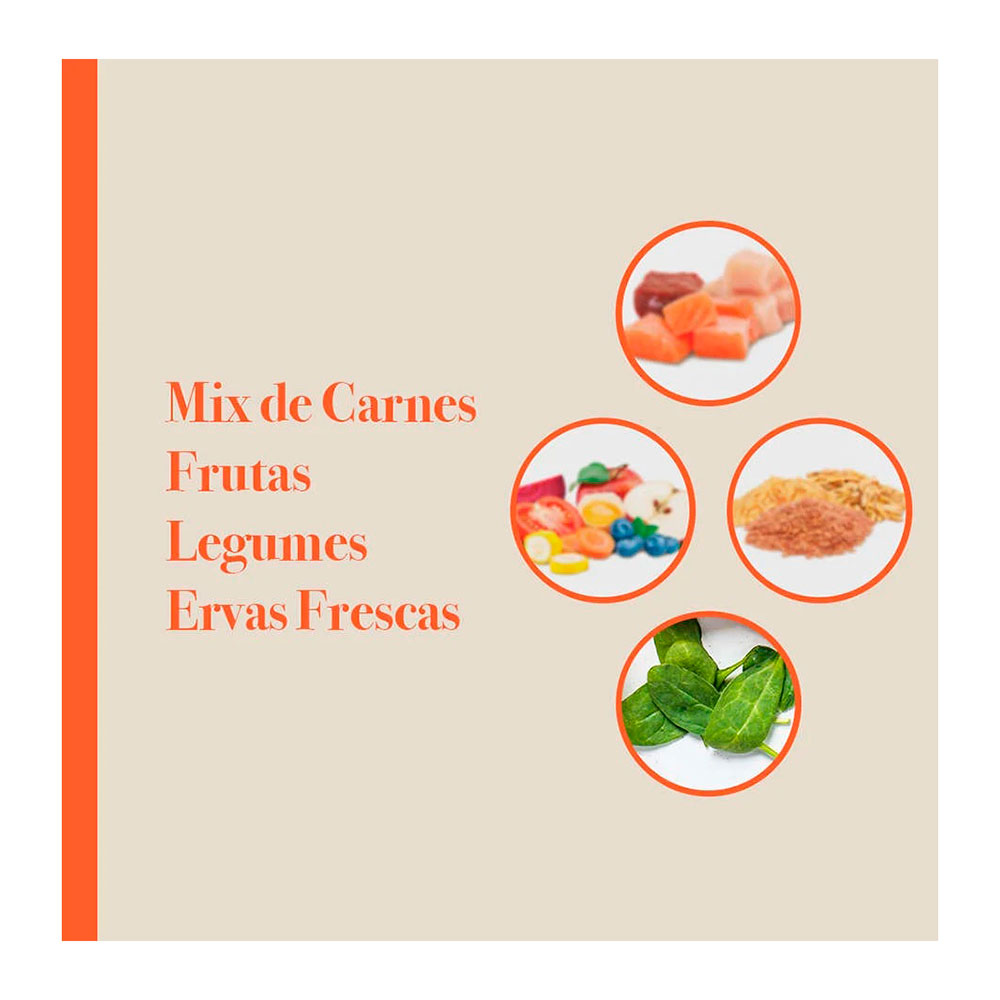 Seleção de carnes frescas (filé de castanha, carne de frango e fígado de frango – fontes naturais de glutamina e glicosamina) (mín. 15%), seleção de frutas, legumes e ervas frescas (maçãs, mamões, cenouras, beterrabas e orégano – fontes naturais de glutamina, betacaroteno, vitaminas, minerais e fibras) (mín. 5%), polpa de tomate concentrada (fonte natural de licopeno), blueberry (mirtilo) em pó, ovo integral pasteurizado desidratado, farinha de torresmo, óleo de peixe refinado (fonte natural de EPA e DHA), sementes de linhaça, farinha de vísceras de frango e gordura de frango