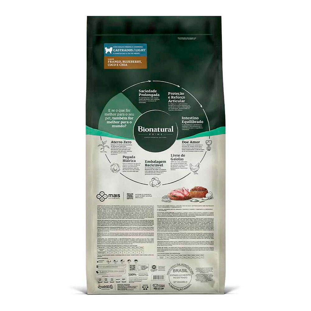 A Ração Bionatural Prime Light Castrados Cães Adultos é um alimento Super Premium completo e balanceado para o seu cão.