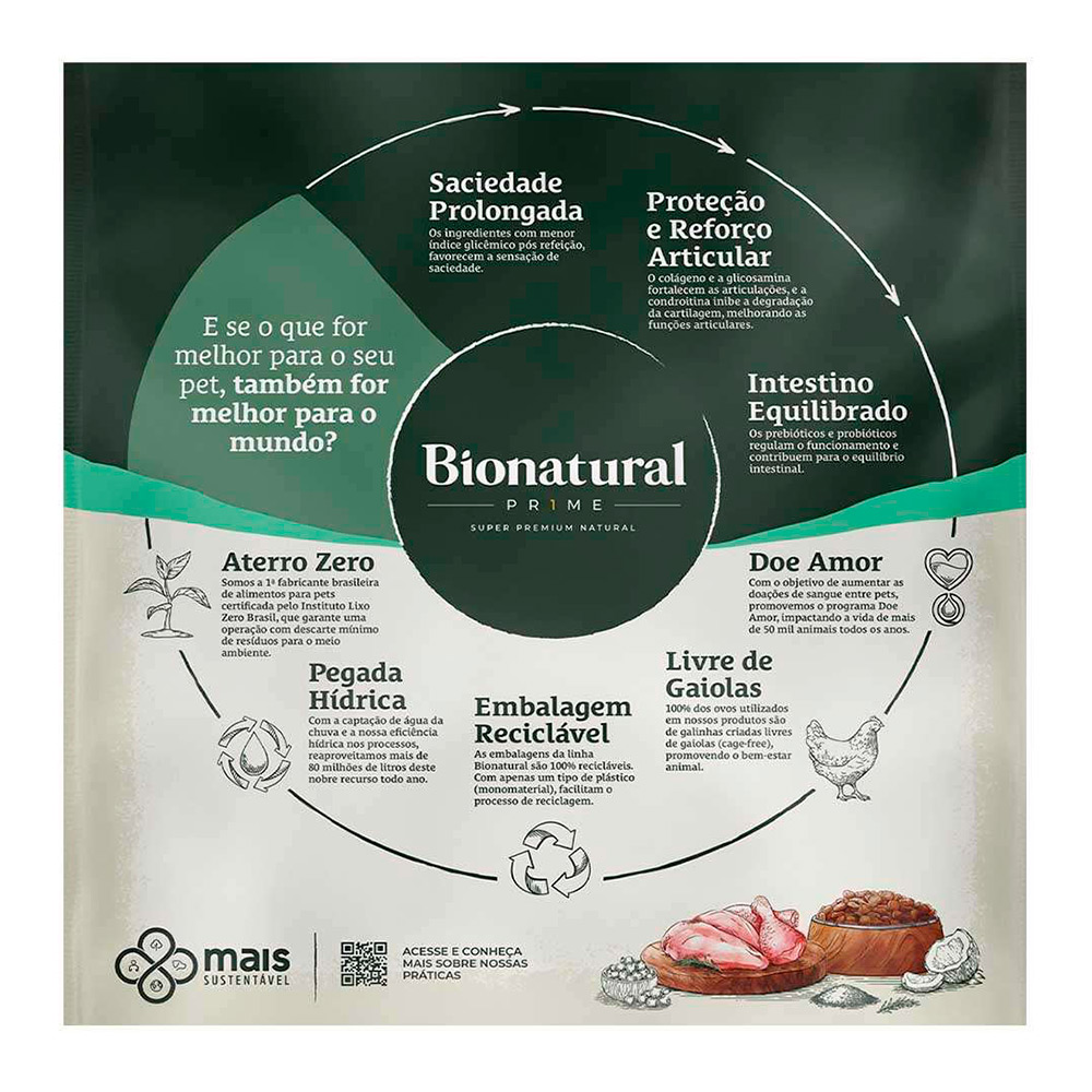 Ração Bionatural Adultos Castrados possui condroitina e glucosamina, que são essenciais para o reforço e proteção articular, promovem uma articulação saudável e maior mobilidade para raças pequenas. Enriquecida com prebióticos e probióticos, que ajudam a manter a flora intestinal saudável.