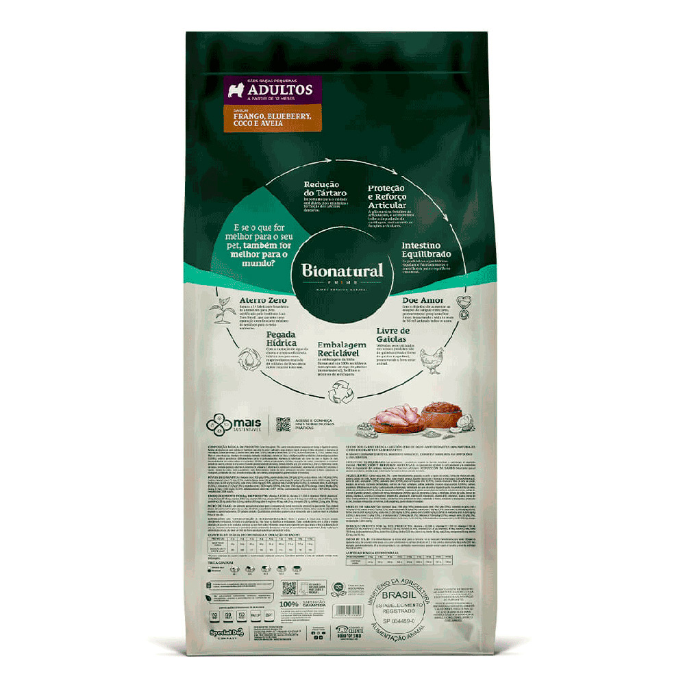 Ração Bionatural Adultos possui condroitina e glucosamina, que são essenciais para o reforço e proteção articular, promovem uma articulação saudável e maior mobilidade para raças pequenas. Enriquecida com prebióticos e probióticos, que ajudam a manter a flora intestinal saudável.