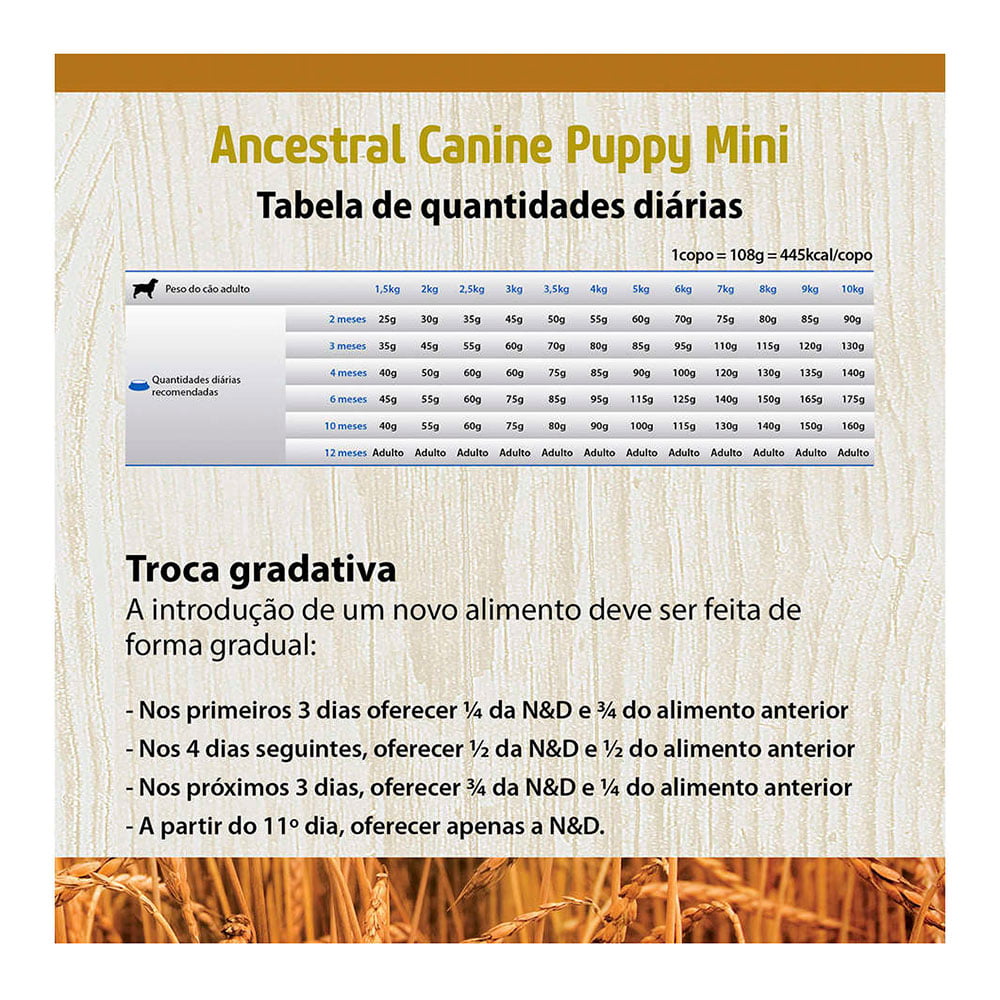 A Ração N&D Ancestral Grain Cães Puppy Mini Frango é uma ração completa e balanceada feita com frango, proteína de alto valor biológico, romã e cereais ancestrais como a aveia e cevada.