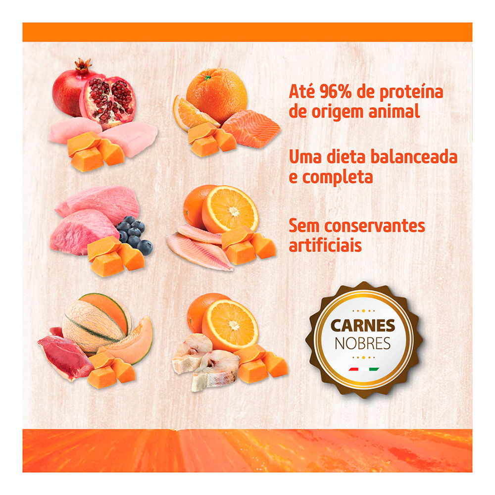 Elaborada com 96% das proteínas de origem animal e abóbora, que é fonte natural de fibras e betacaroteno e contribui para manter o sistema imunológico forte, além de colaborar com a saúde digestiva, urinária, prevenção do câncer.
