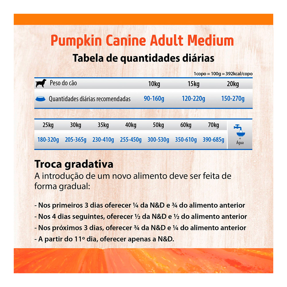 N&D Pumpkin Cães Adultos Raças Médias é completa e balanceada, livre de cereais, sem transgênicos e apenas conservado naturalmente, sem corantes e conservantes artificiais, e ainda contém baixa quantidade de carboidratos.