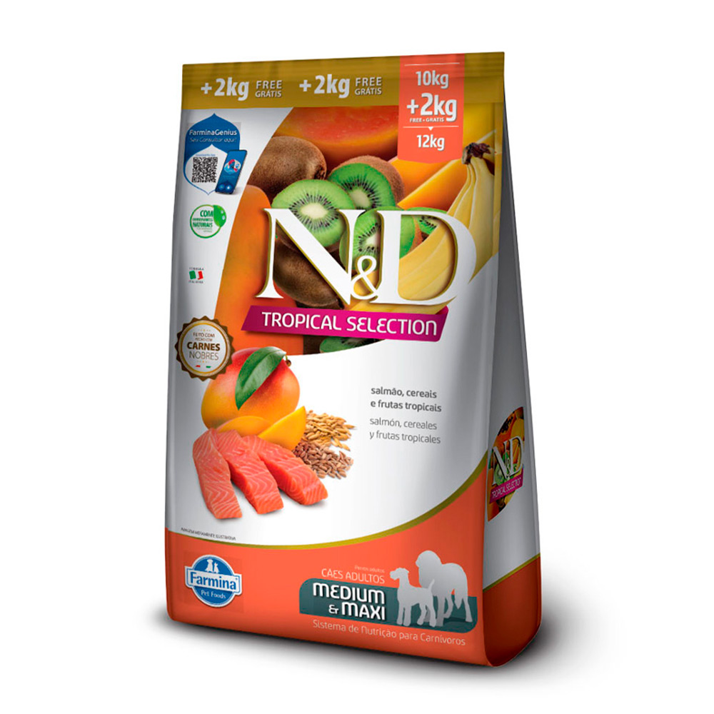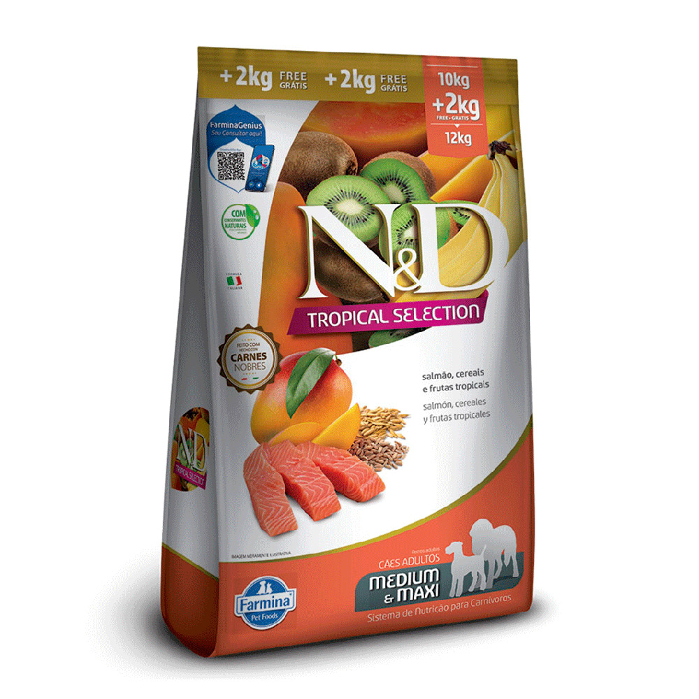 A Ração N&D Tropical Selection Cães Adultos Medium e Maxi Salmão é ideal para os cães de porte médio e grande. Proporciona uma alimentação completa e balanceada.