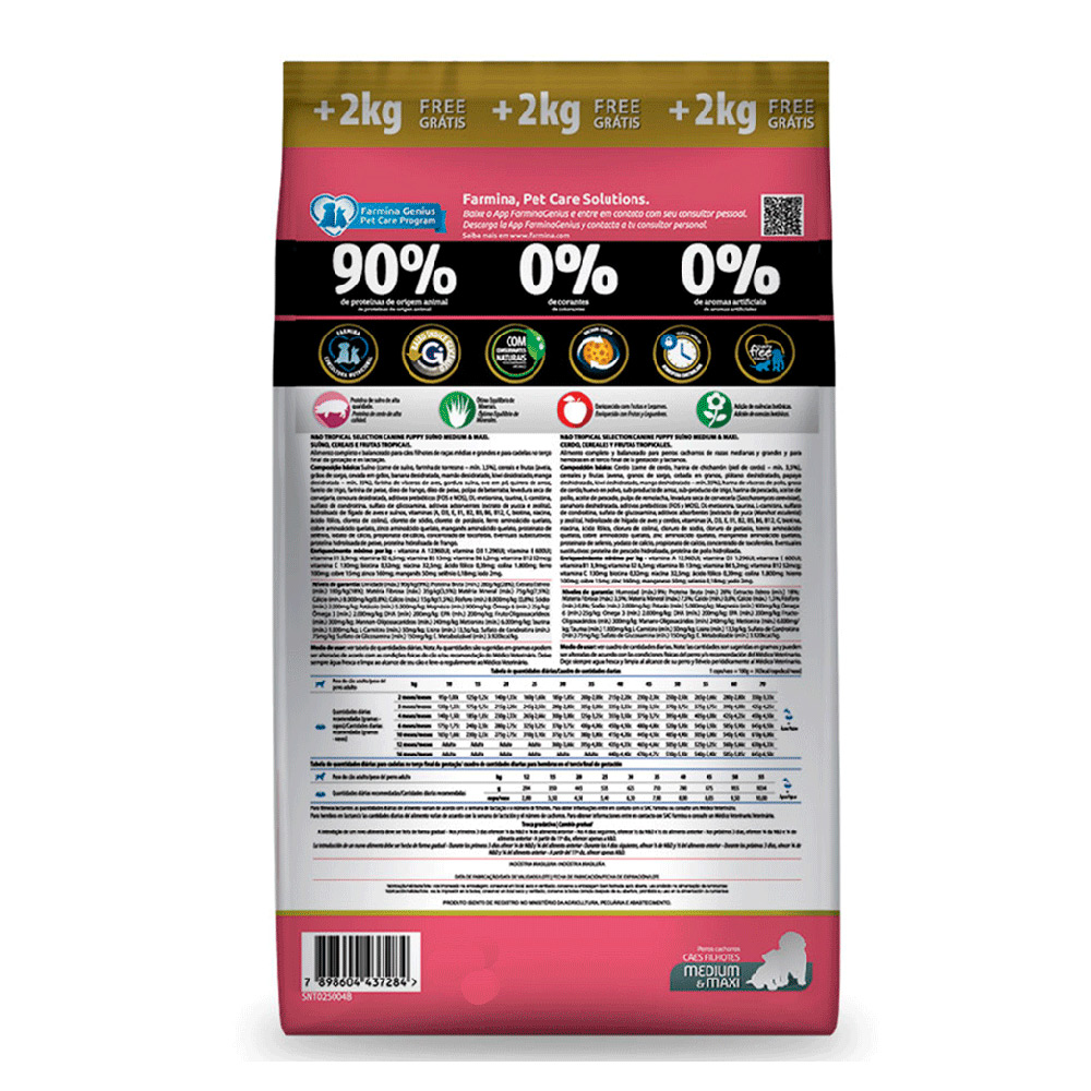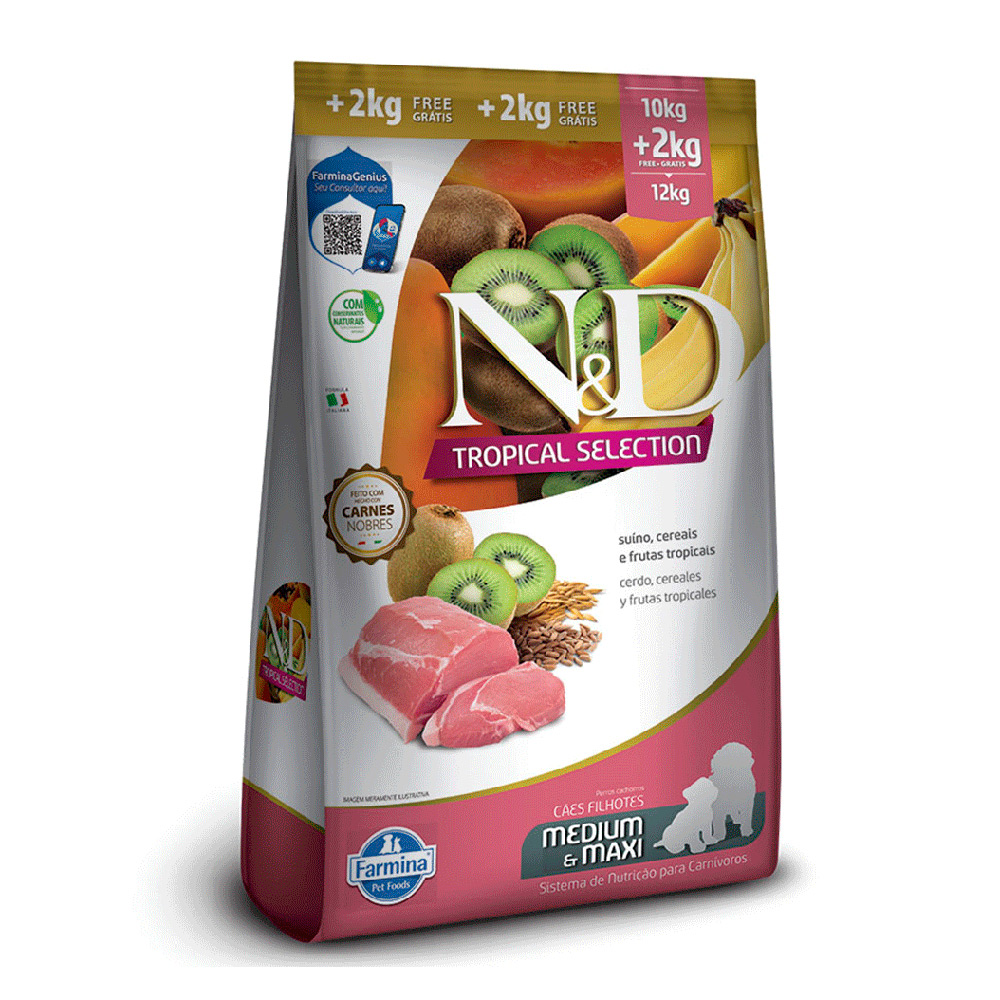 A Ração N&D Tropical Selection Cães Filhotes Medium e Maxi Suíno é ideal para os cães em fase de crescimento e para cadelas no terço final da gestação e em lactação, fornece todo o aporte necessário de nutrientes.