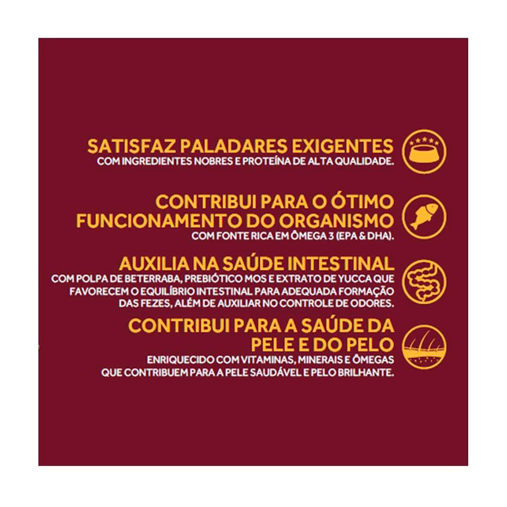 GranPlus Gourmet Cães Adultos Mini Salmão e Frango é conservada com antioxidantes naturais sendo livre de transgênicos, aromatizantes e corantes artificiais.