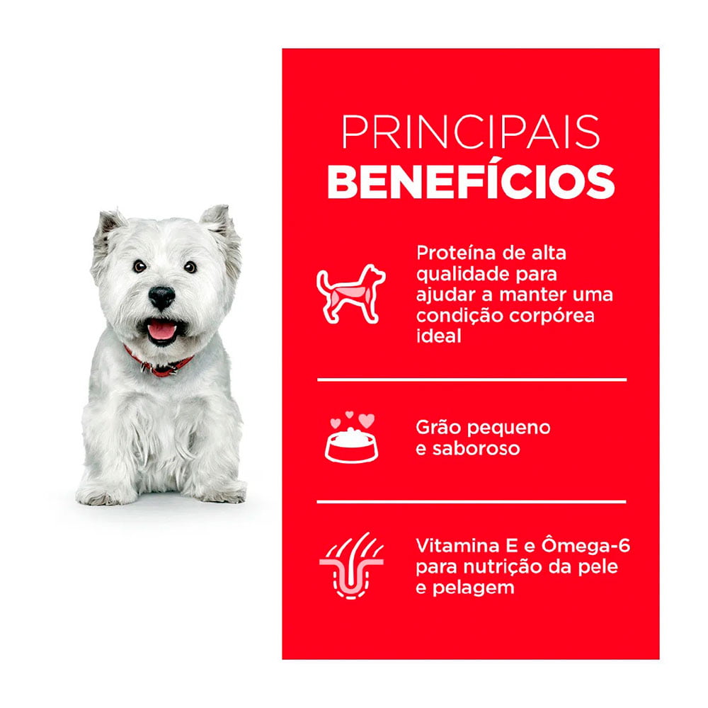 Hill’s Cães Adultos saudáveis com pele sensível de pequeno porte, proteínas de alta qualidade para uma condição corpórea ideal. Fibras de alta qualidade, ácidos graxos e antioxidantes que ajudam a manter a pele, pelagem e digestão saudáveis.