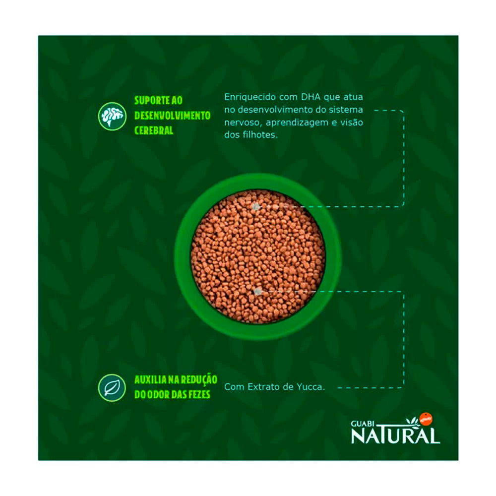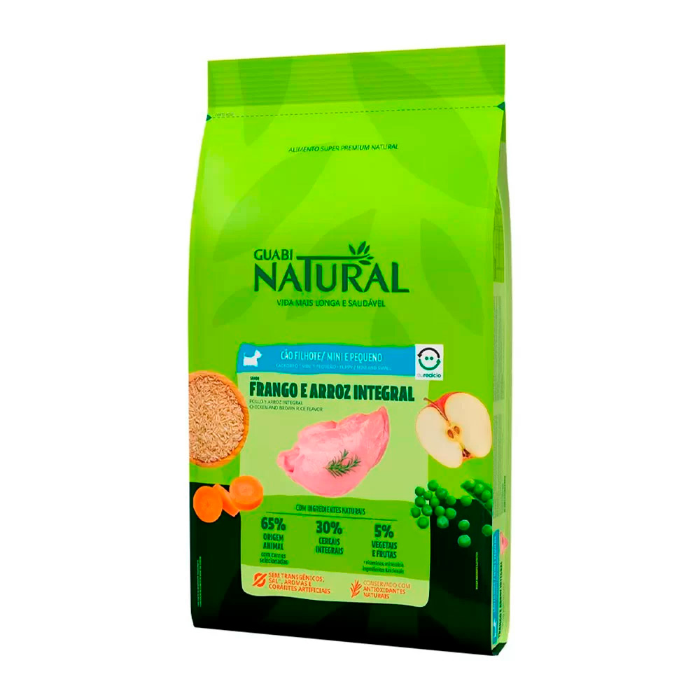 A Ração Guabi Natural Frango e Arroz Integral para Cães Filhotes Raças Mini e Pequena, é um alimento Super Premium feito com carnes selecionadas e ingredientes essenciais, sem transgênicos, corantes e aromas artificiais.