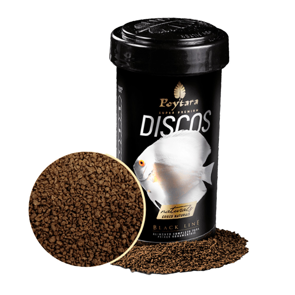 A Poytara Discos Naturals Black Line é um alimento completo super premium em crisps desenvolvido para atender as exigências nutricionais de acarás-disco e espécies afins. Contêm ingredientes nobres, vitaminas e minerais orgânicos que auxiliam no desenvolvimento sem alterar a coloração natural dos peixes.