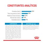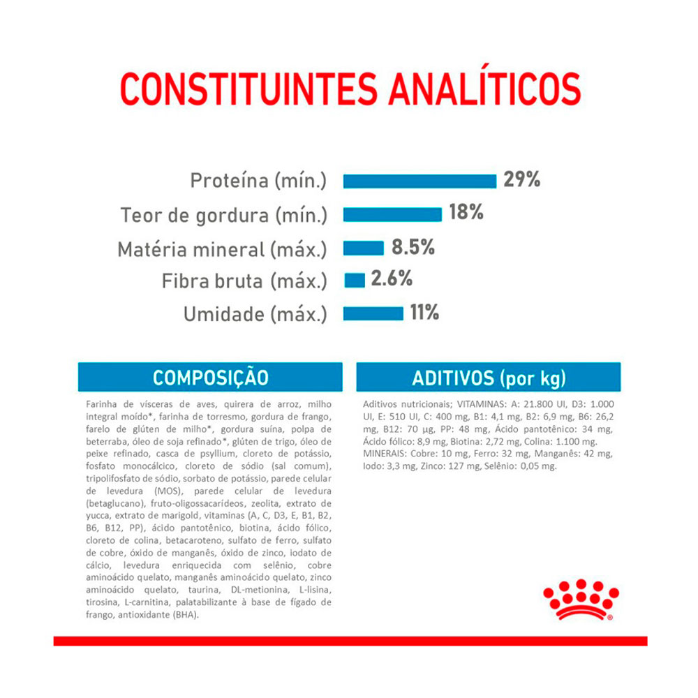 Farinha de vísceras de aves, quirera de arroz, milho moído*, gordura de frango, gordura suína, farinha de torresmo, farelo de glúten de milho*, polpa desidratada de beterraba, glúten de trigo, óleo de soja refinado*, casca de psyllium, óleo branqueado e desodorizado de peixes, óleo de microalgas (Schizochytrium sp.), cloreto de potássio, fosfato monocálcico, cloreto de sódio (sal comum), carbonato de cálcio, tripolifosfato de sódio, sorbato de potássio, frutooligossacarídeos, mananoligossacarídeos, parede celular de levedura (beta glucanas), extrato de marigold (Tagetes erecta), zeolita, extrato de yucca, retinol (vitamina A), ácido ascórbico (vitamina C), colecalciferol (vitamina D3), acetato de dl-alfa tocoferol (vitamina E), cloridrato de tiamina (vitamina B1), riboflavina (vitamina B2), cloridrato de piridoxina (vitamina B6), cianocobalamina (vitamina B12), ácido nicotínico (niacina), D-pantotenato de cálcio, biotina, ácido fólico, cloreto de colina, betacaroteno, sulfato de ferro, sulfato de cobre, óxido de manganês, óxido de zinco, iodato de cálcio, levedura enriquecida com selênio, zinco aminoácido quelato, manganês aminoácido quelato, cobre aminoácido quelato, taurina, DL-metionina, hidrolisado de fígado de aves, antioxidante BHA (butilhidroxianisol).