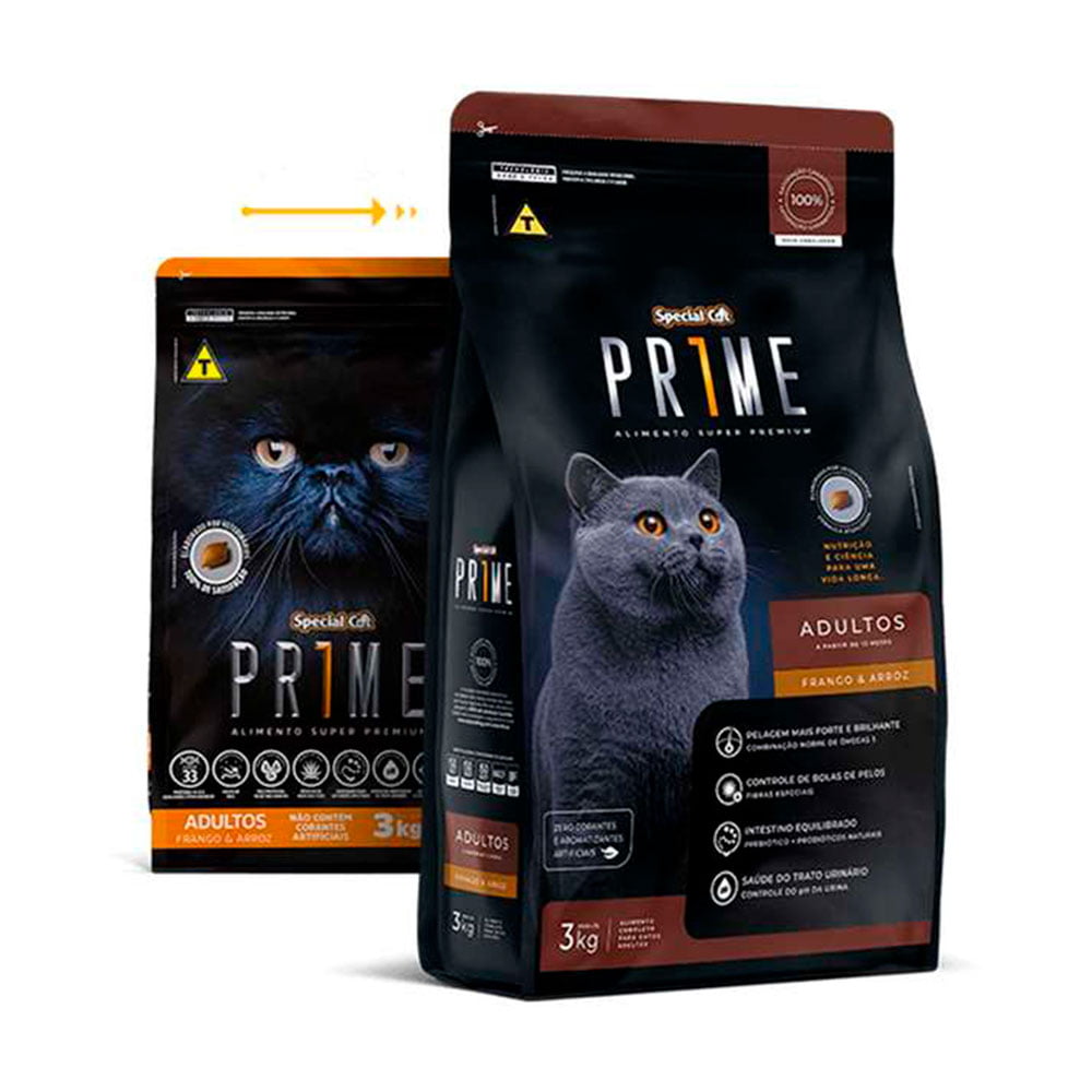 Ração Special Cat Prime Frango e Arroz para Gatos Adultos é um alimento Super Premium completo e balanceado, indicado para gatos adultos. Elaborado por veterinários, possui fontes protéicas nobres como a proteína isolada de suíno e o ovo integral em pó.