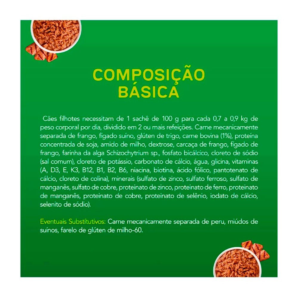 Carne mecanicamente separada de frango, fígado suíno, glúten de trigo, carne bovina (1%), proteína concentrada de soja, amido de milho, dextrose, carcaça de frango, fígado de frango, farinha da alga Schizochytrium sp., fosfato bicálcico, cloreto de sódio (sal comum), cloreto de potássio, carbonato de cálcio, água, glicina, vitaminas (A, D3, E, K3, B12, B1, B2, B6, niacina, biotina, ácido fólico, pantotenato de cálcio, cloreto de colina), minerais (sulfato de zinco, sulfato ferroso, sulfato de manganês, sulfato de cobre, proteinato de zinco, proteinato de ferro, proteinato de manganês, proteinato de cobre, proteinato de selênio, iodato de cálcio, selenito de sódio). Eventuais Substitutivos: carne mecanicamente separada de peru, miúdos de suínos, farelo de glúten de milho-60.