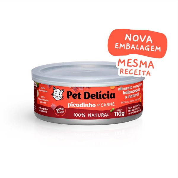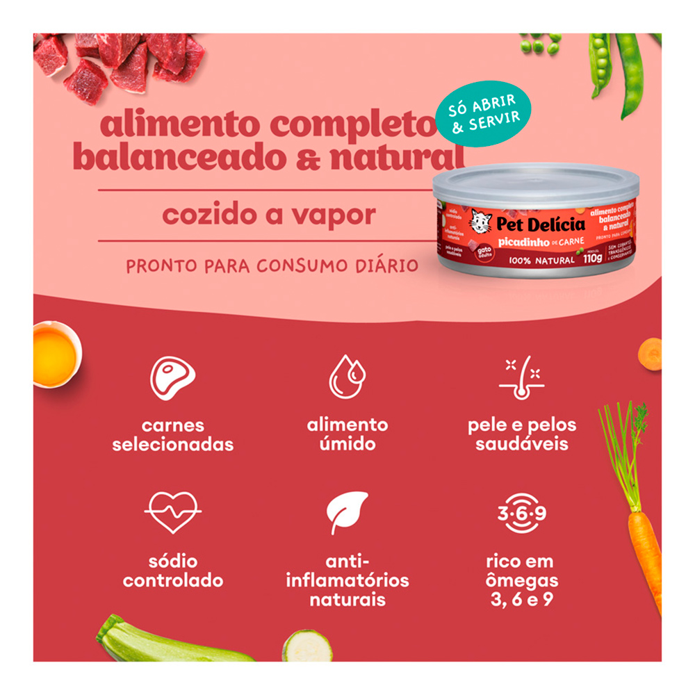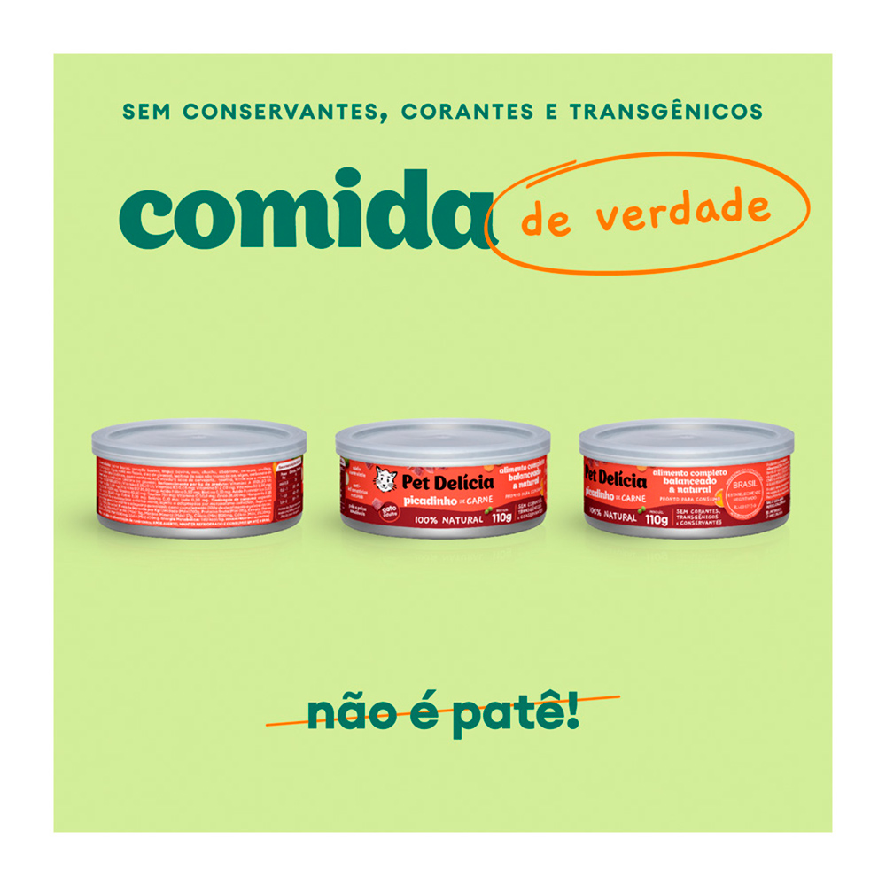 Pet Delícia Picadinho de Carne é ideal para gatos adultos, contém gorduras saudáveis inclusive ômegas 3 e 6, fibras e prebióticos que melhoram o sistema digestivo do gato.